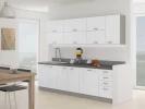 Tretí príklad je kuchyňa v minimalistickom štýle, ktorá kladie dôraz na jednoduchosť a funkčnosť. Táto kuchyňa má biele skrinky bez úchytov, ktoré plynule nadväzujú na biele steny a strop. Tento jednotný dizajn zväčšuje vizuálne priestor a dodáva kuchyni čistotu a svetlosť. Hlavným prvkom tejto kuchyne je vstavaná skriňa s posuvnými dverami, ktorá slúži ako úložný priestor a jedáleň. Skriňa je vybavená policami, zásuvkami a skrinkami, ktoré poskytujú dostatok miesta na riad, prístroje a potraviny. Skriňa tiež obsahuje vstavanú rúru, mikrovlnnú rúru a chladničku. Na skrini je skladacia doska, ktorá slúži ako jedálenský stôl alebo pracovná plocha. Keď sa nepoužíva, zloží sa a schová do skrine, čím uvoľní priestor. Ku doske patria aj štyri skladacie stoličky s bielymi plastovými sedadlami a operadlami, ktoré sa tiež dajú ľahko uložiť do skrine. Kuchyňa je osvetlená vstavanými LED svetlami, ktoré sú pod skrinkami a nad pracovnou doskou.