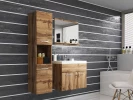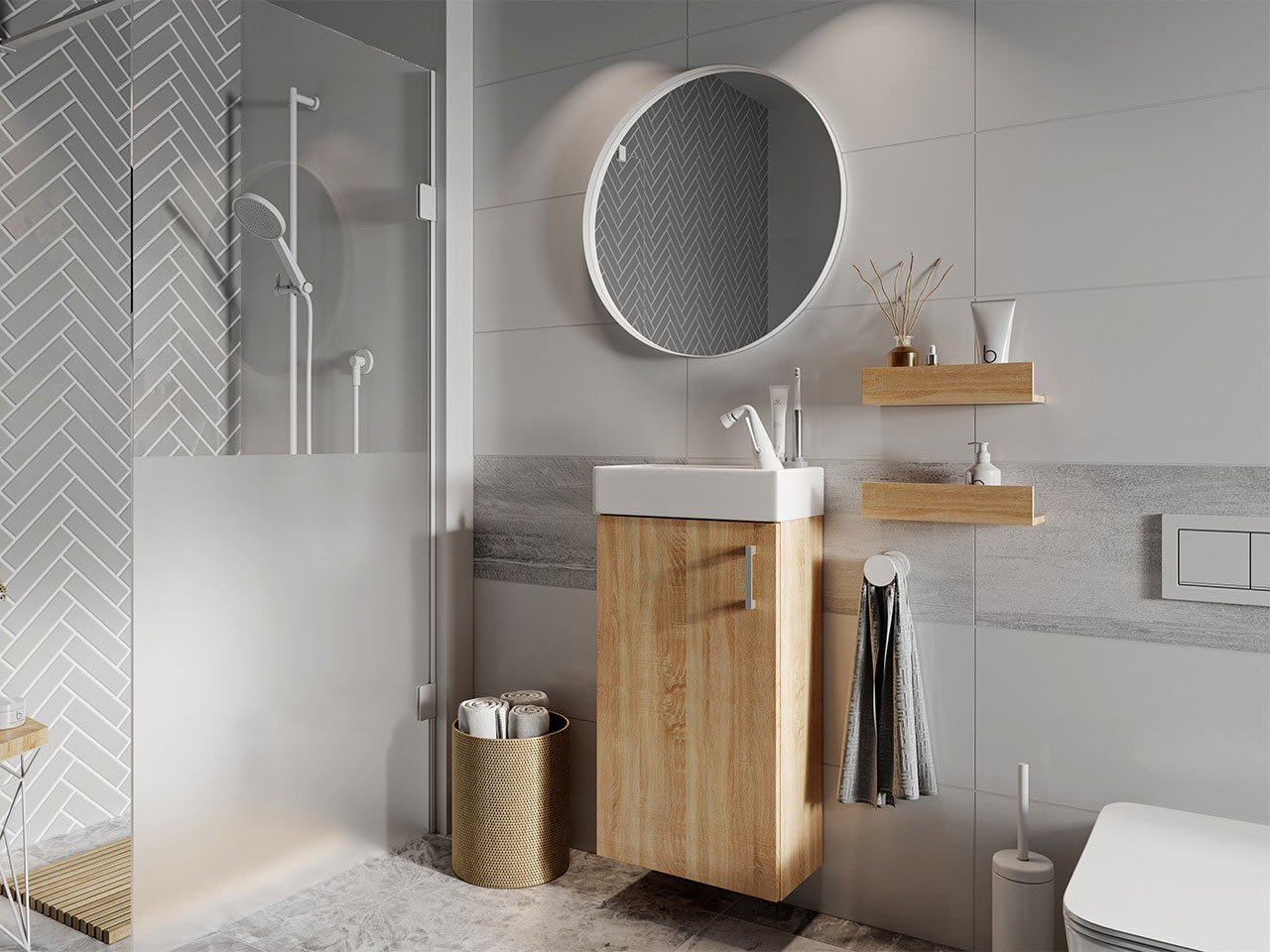 Neutíchajúce minimalistické trendy odľahčili priestor pod umývadlom, ktorý bol donedávna ťažiskom úložného miesta v kúpeľni. Ten sa presunul vedľa umývadiel, ale aj na doposiaľ nevyužité steny v podobe závesných skriniek neobmedzených rozmerov. Pod umývadlami zostávajú skrinky s minimálnou výškou zásadne bez nožičiek. Výrazne sa rozšírila škála povrchových materiálov a farebných prevedení. Tá môže esteticky a štýlovo zjednotiť nábytok kúpeľne s ostatným interiérom. Prevládajúcim materiálom sú drevené dýhy a ich laminátové imitácie. Z drevín si prvenstvo udržiavajú exotické s výraznou textúrou, v tesnom závese s dubovým drevom. Efektným oživením matných drevených plôch sú jednofarebné lakované povrchy. Nájdete ich na čelách zásuviek a dvierok. Budete in, keď vsadíte na čiernu alebo bordovú.