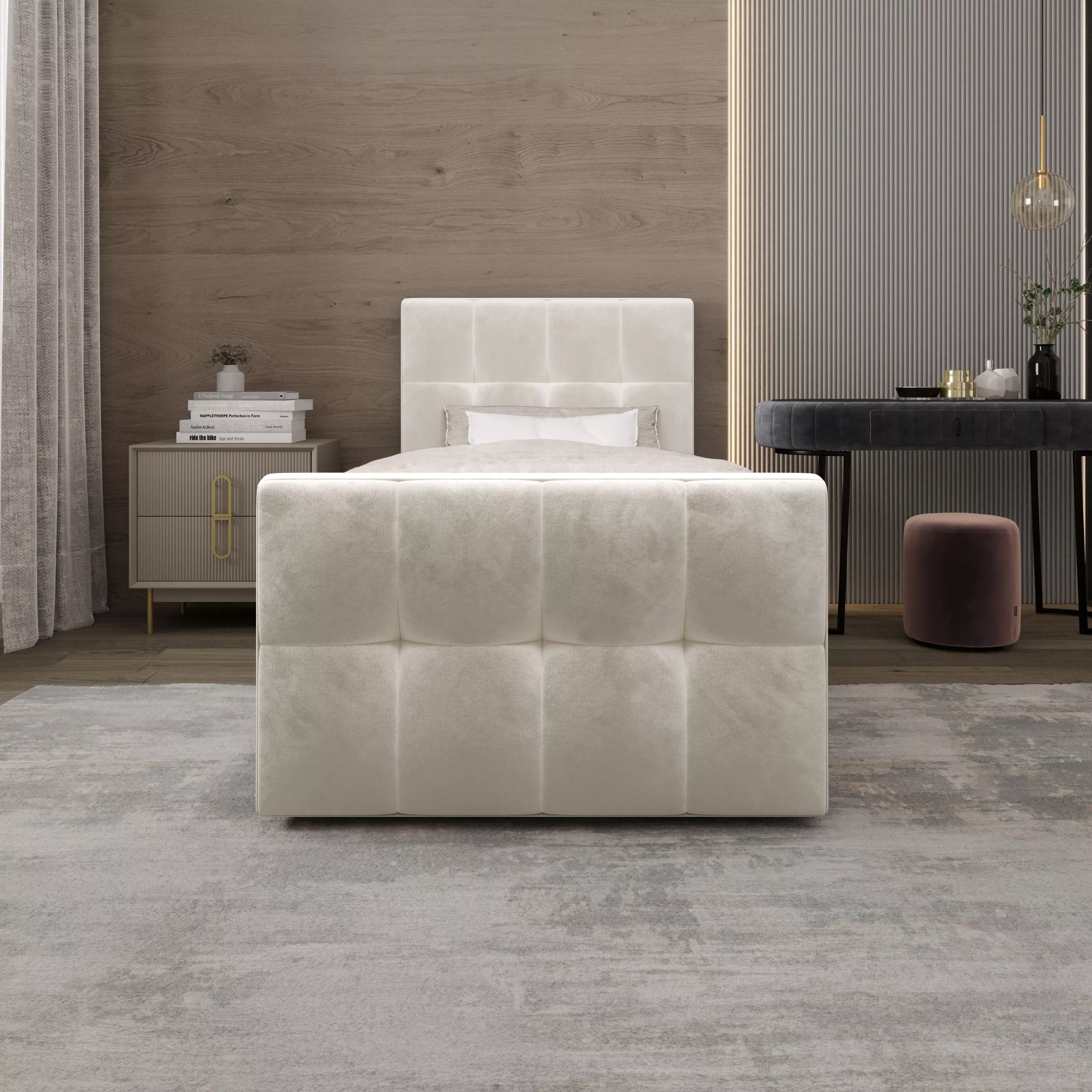 Jednolôžková boxspringová posteľ 120x200 ELIONE 1 na prvý pohľad zaujme svojím dizajnovým spracovaním v podobe prešívaných čiel. Posteľ sa hodí do všetkých moderných študentských izieb.