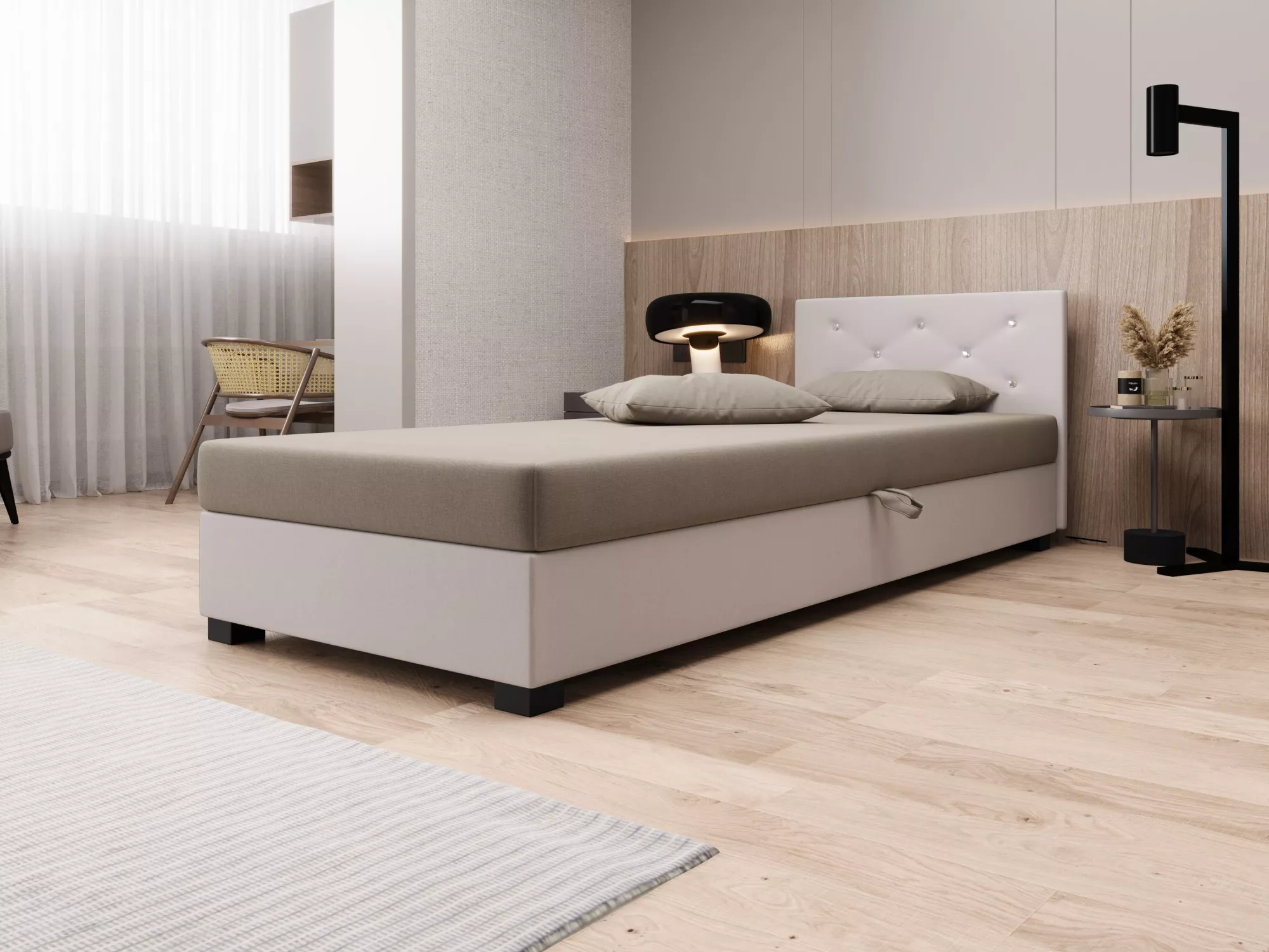 Čalúnená posteľ 110x195 MILEKA 2 zaujme predovšetkým svojím prešívaným čelom s ozdobnými gombíkmi. Pohodlný matrac poskytne všetok komfort pre odpočinok a relaxáciu. Posteľ disponuje priestranným úložným priestorom, kde môžete schovať lôžkoviny alebo sezónne oblečenie.