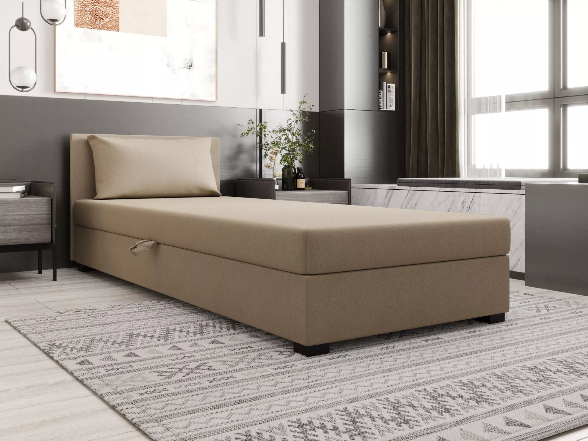 Jednolôžková posteľ 110x195 ZAJDA 2 s úložným priestorom svojím jednoduchým minimalistickým dizajnom zapadne do každej študentskej izby. Vysoké čalúnené čelo zabráni poškriabaniu a zašpineniu steny. Príjemná poťahová látka zvýši komfort používania.