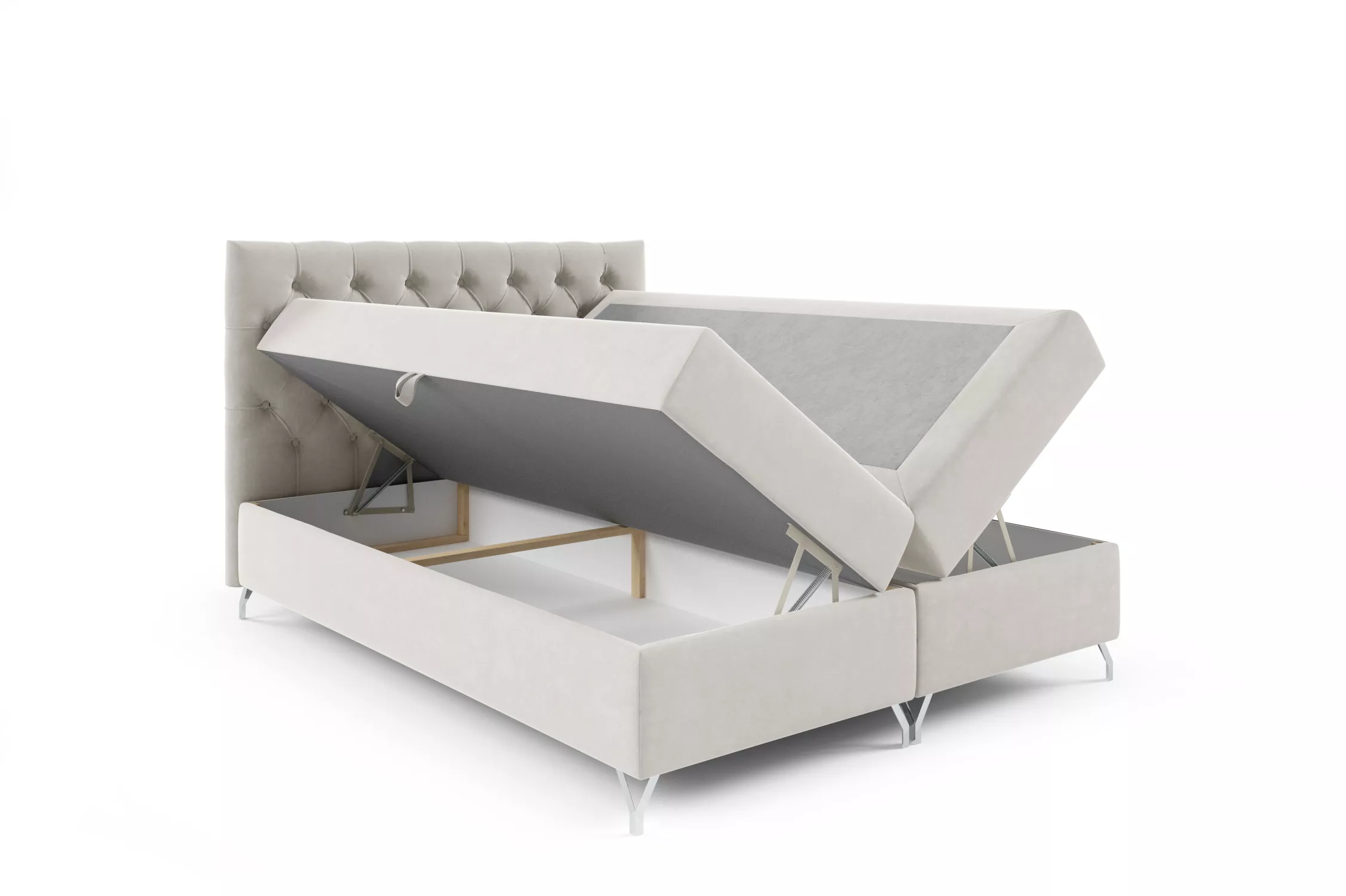 Luxusná boxspringová posteľ SHANNON je synonymom komfortu. Prešívané čelo zabezpečí pohodlné opretie pri čítaní, nadčasovú eleganciu podčiarkujú vysoké kovové nožičky.