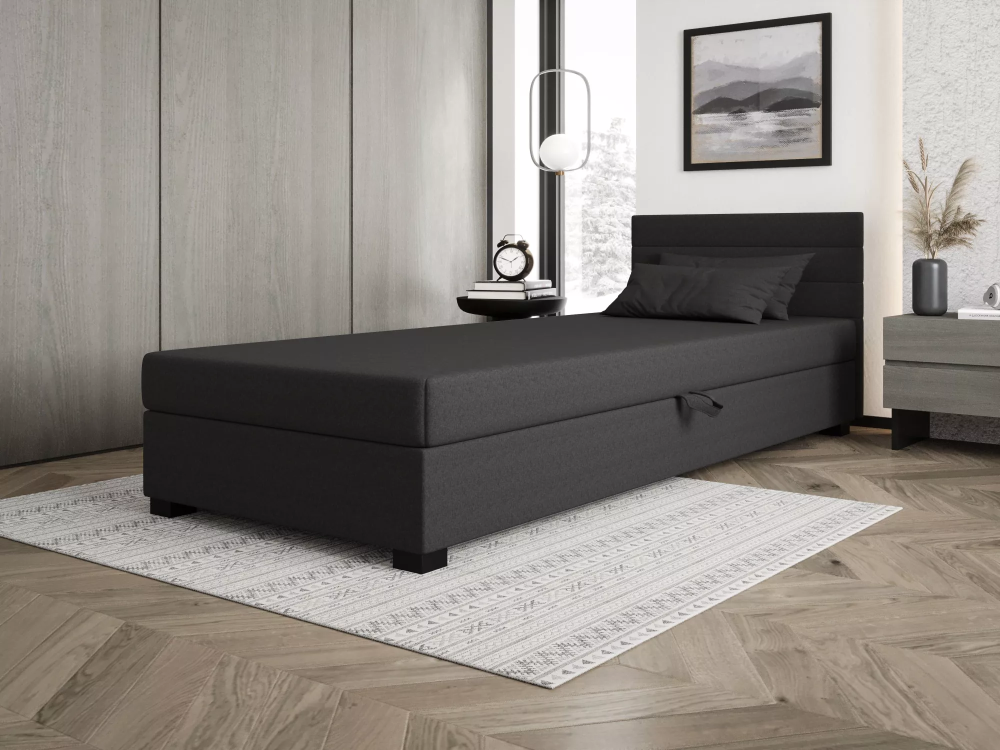 Čalúnená posteľ 100x195 KASANDRA 1 s úložným priestorom svojím jednoduchým minimalistickým dizajnom zapadne do každej študentskej izby. Vysoké čalúnené čelo zabráni poškriabaniu a zašpineniu steny.