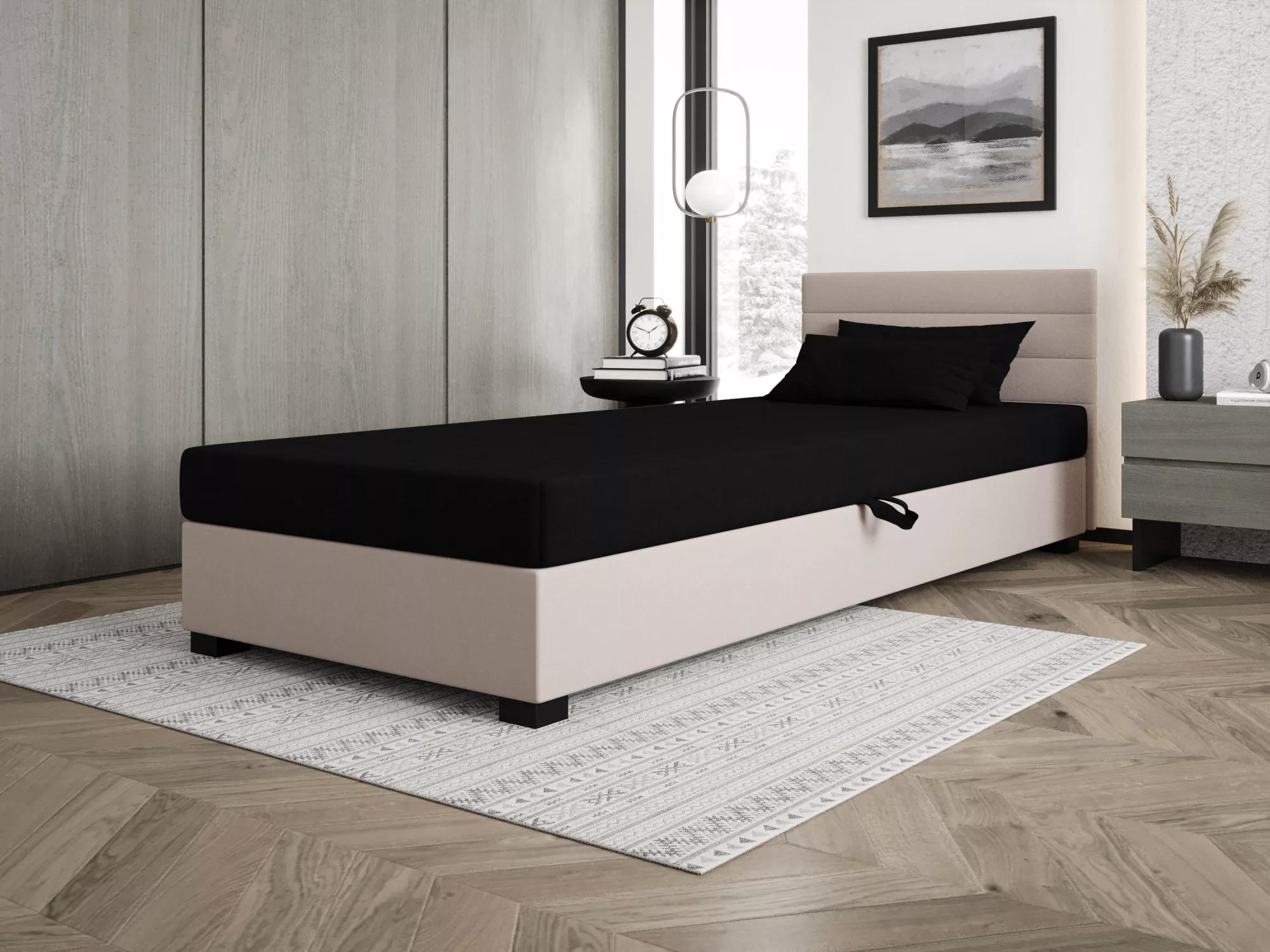 Čalúnená posteľ 80x195 KASANDRA 2 s úložným priestorom svojím jednoduchým minimalistickým dizajnom zapadne do každej študentskej izby. Vysoké čalúnené čelo zabráni poškriabaniu a zašpineniu steny.