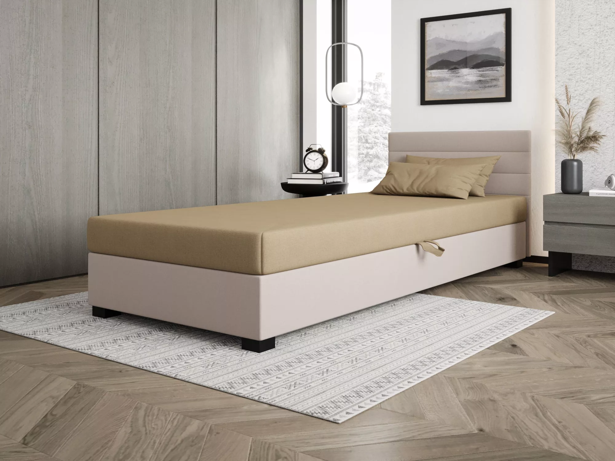 Čalúnená posteľ 80x195 KASANDRA 2 s úložným priestorom svojím jednoduchým minimalistickým dizajnom zapadne do každej študentskej izby. Vysoké čalúnené čelo zabráni poškriabaniu a zašpineniu steny.