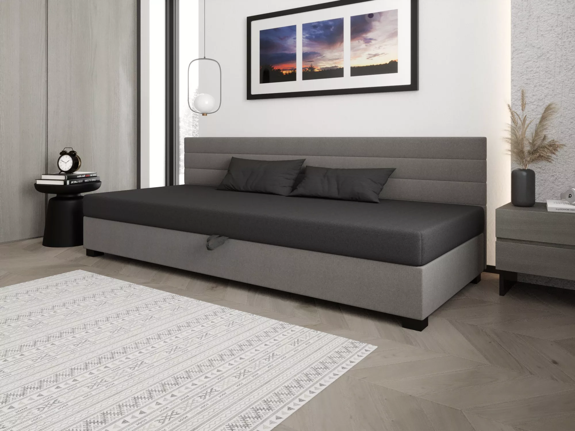 Čalúnená posteľ 90x195 KASANDRA BIZ 1 s úložným priestorom svojím jednoduchým minimalistickým dizajnom zapadne do každej študentskej izby. Vysoké čalúnené čelo zabráni poškriabaniu a zašpineniu steny.