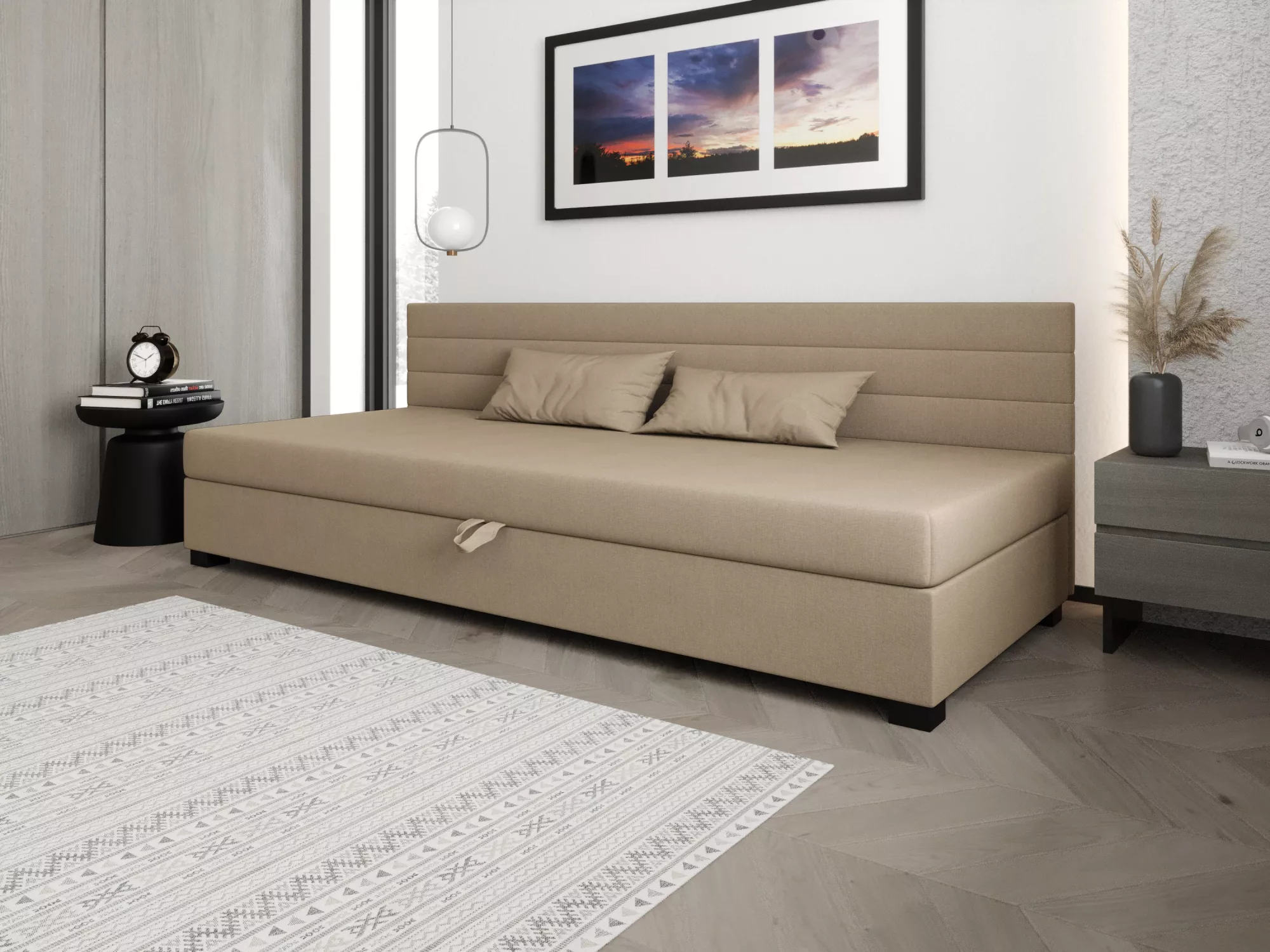 Čalúnená posteľ 120x195 KASANDRA BIZ 1 s úložným priestorom svojím jednoduchým minimalistickým dizajnom zapadne do každej študentskej izby. Vysoké čalúnené čelo zabráni poškriabaniu a zašpineniu steny.