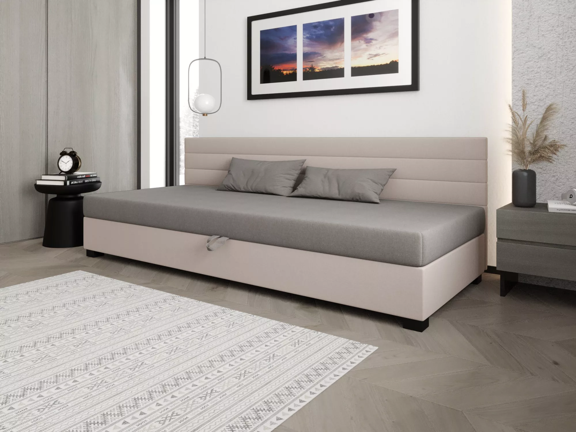 Čalúnená posteľ 120x195 KASANDRA BIZ 2 s úložným priestorom svojím jednoduchým minimalistickým dizajnom zapadne do každej študentskej izby. Vysoké čalúnené čelo zabráni poškriabaniu a zašpineniu steny.