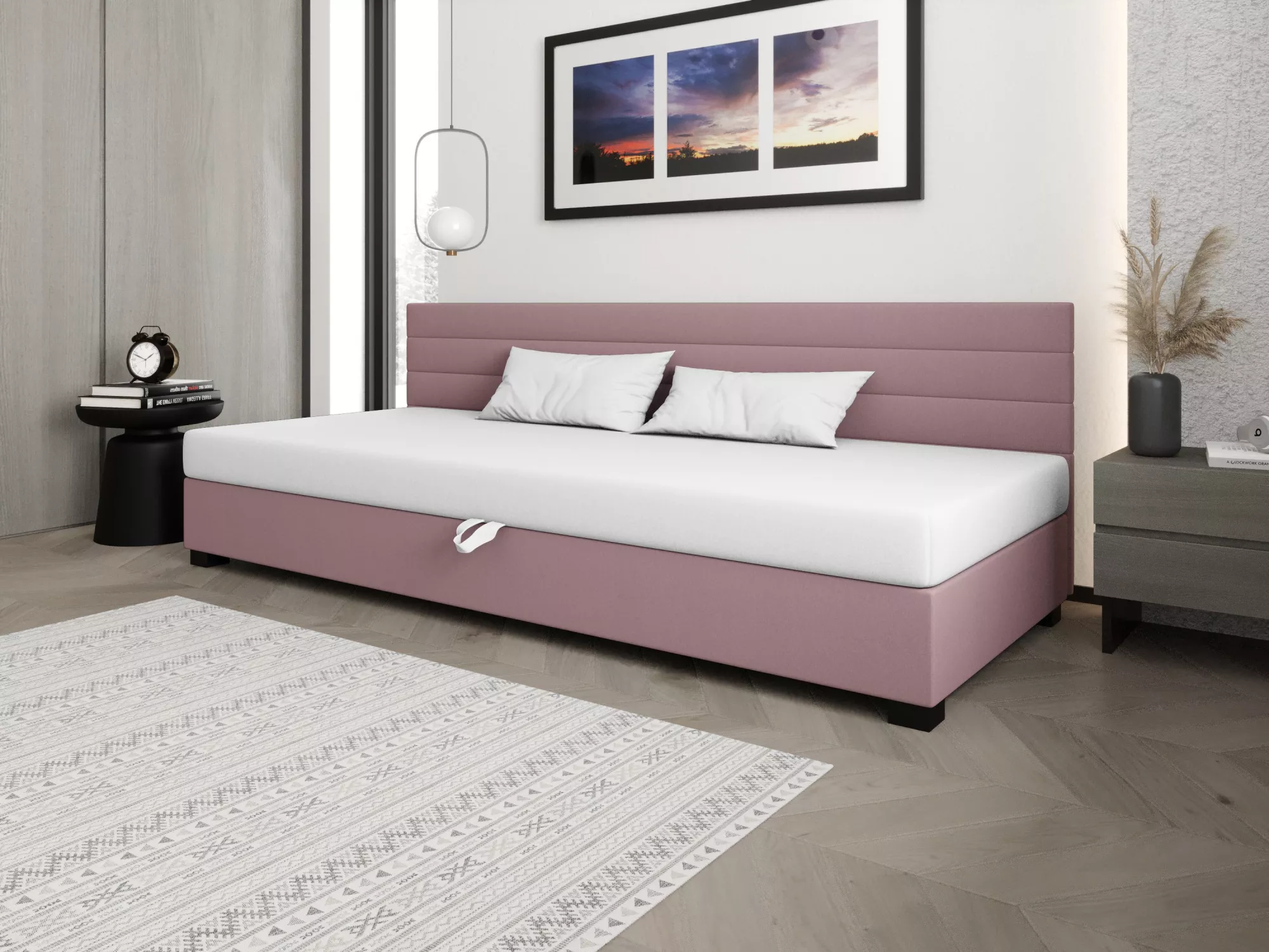 Čalúnená posteľ 120x195 KASANDRA BIZ 2 s úložným priestorom svojím jednoduchým minimalistickým dizajnom zapadne do každej študentskej izby. Vysoké čalúnené čelo zabráni poškriabaniu a zašpineniu steny.