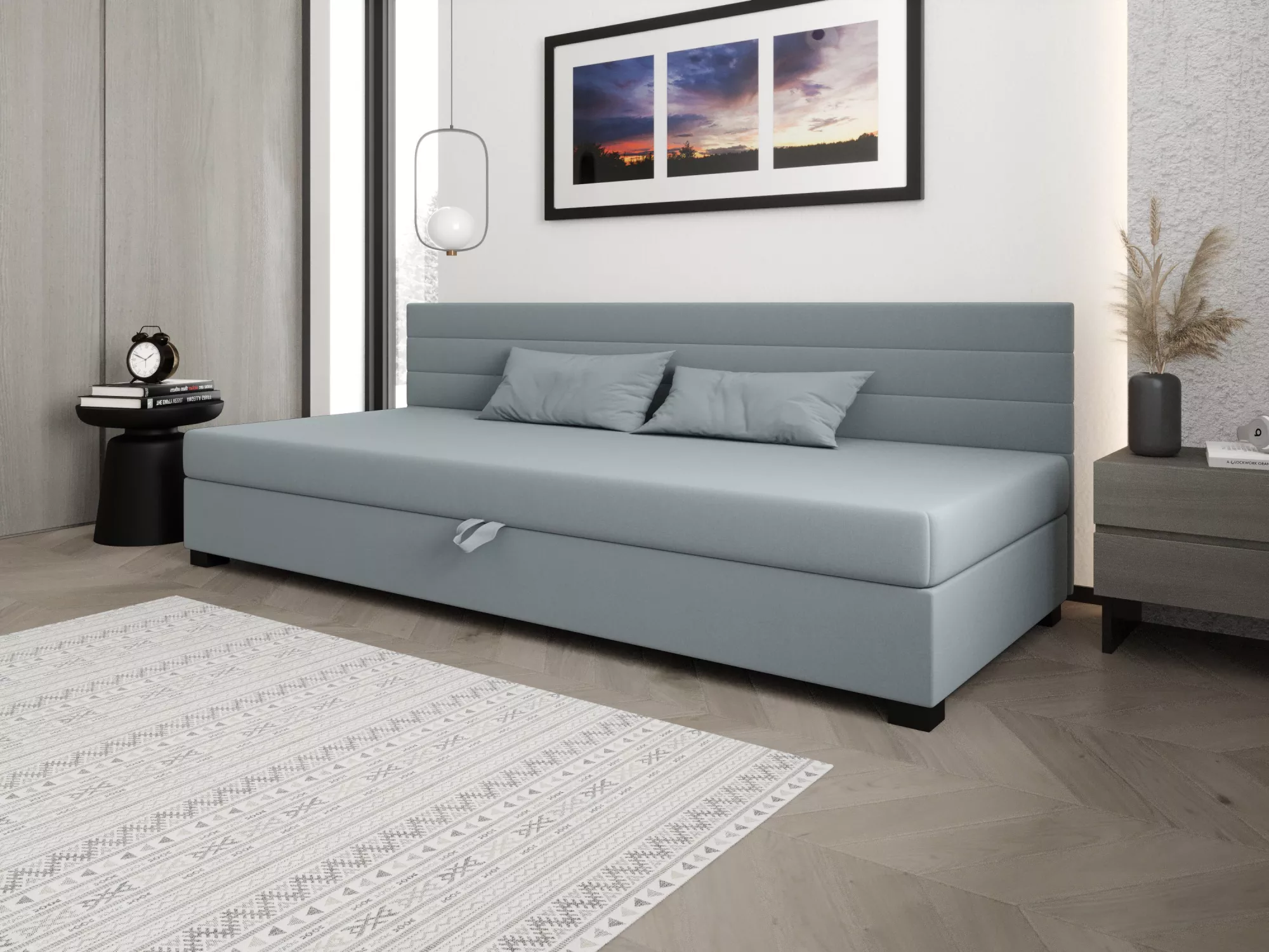 Čalúnená posteľ 110x195 KASANDRA BIZ 2 s úložným priestorom svojím jednoduchým minimalistickým dizajnom zapadne do každej študentskej izby. Vysoké čalúnené čelo zabráni poškriabaniu a zašpineniu steny.