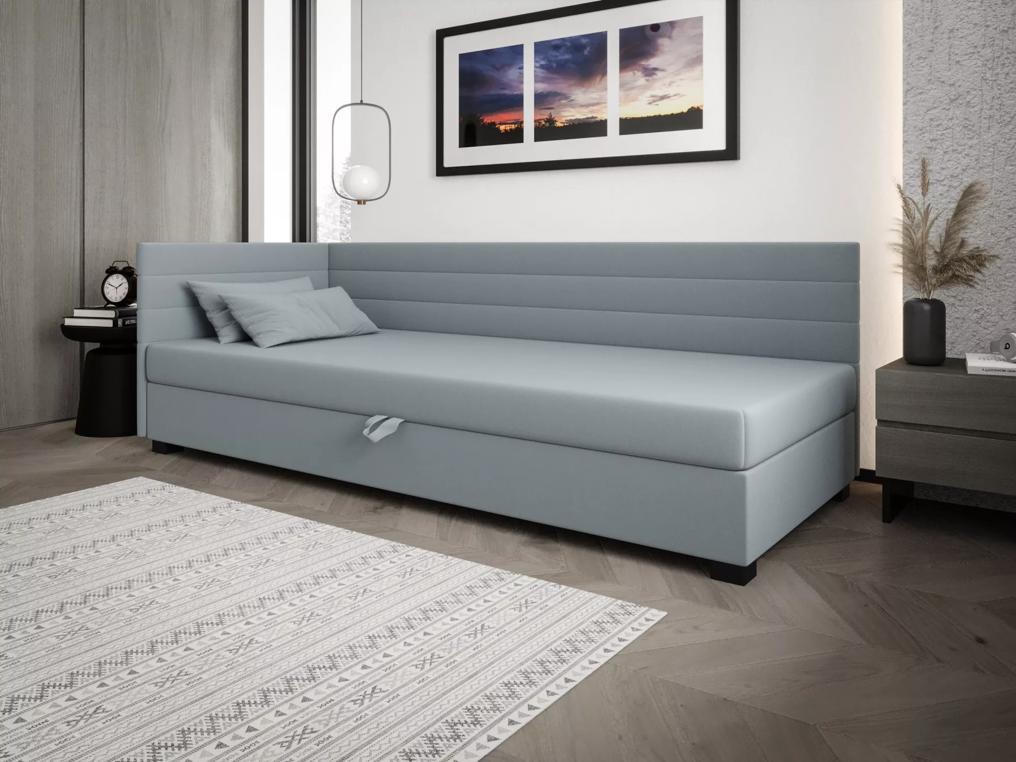 Čalúnená posteľ 100x195 KASANDRA PLUS 1 s úložným priestorom svojím jednoduchým minimalistickým dizajnom zapadne do každej študentskej izby. Vysoké čalúnené čelo zabráni poškriabaniu a zašpineniu steny.