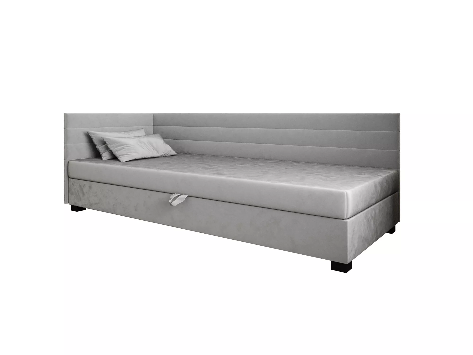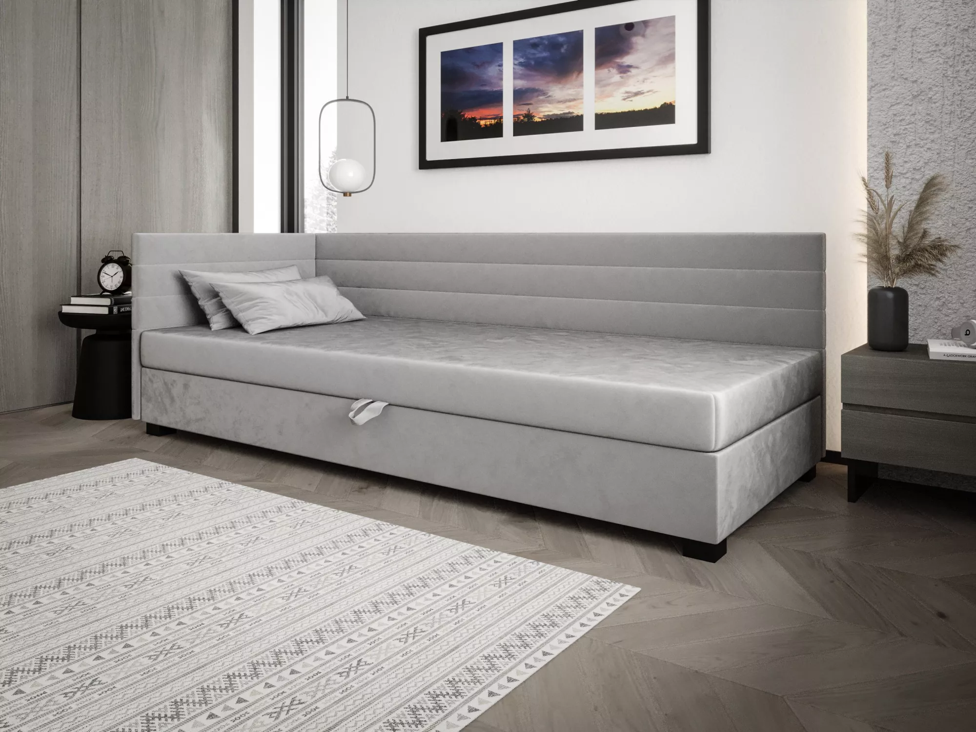 Čalúnená posteľ 90x195 KASANDRA PLUS 1 s úložným priestorom svojím jednoduchým minimalistickým dizajnom zapadne do každej študentskej izby. Vysoké čalúnené čelo zabráni poškriabaniu a zašpineniu steny.