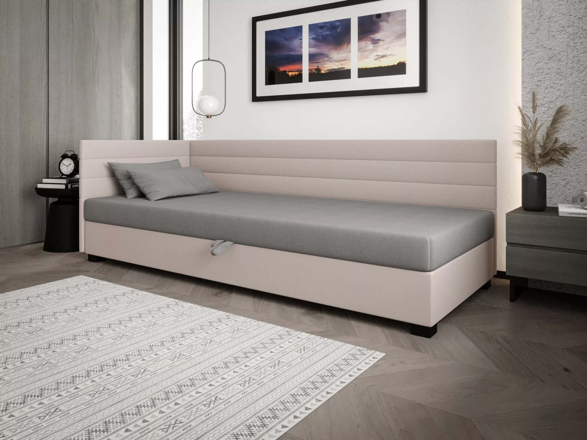 Čalúnená posteľ 100x195 KASANDRA PLUS 2 s úložným priestorom svojím jednoduchým minimalistickým dizajnom zapadne do každej študentskej izby. Vysoké čalúnené čelo zabráni poškriabaniu a zašpineniu steny.