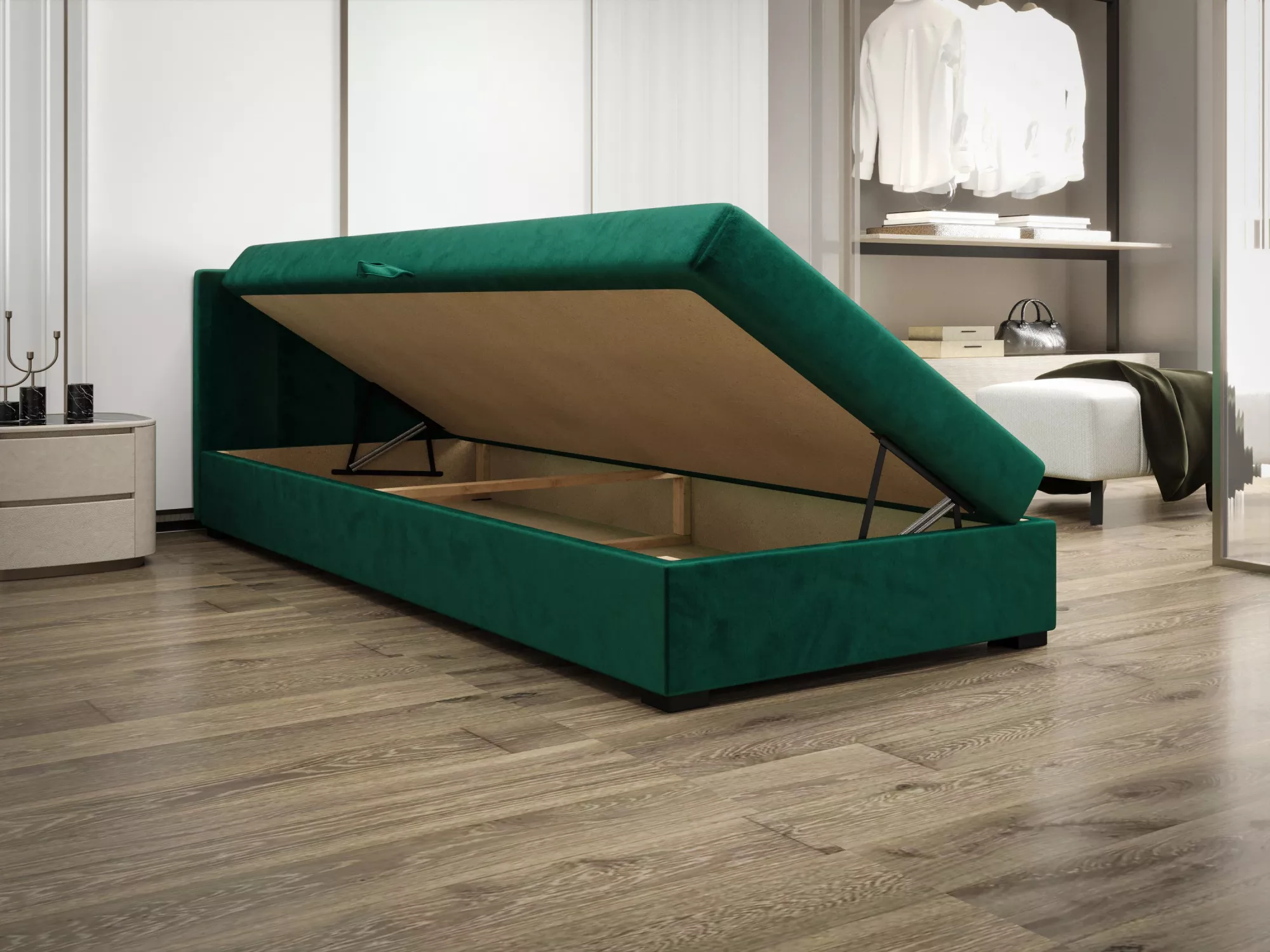 Jednolôžková posteľ 110x195 MANKA 1 disponuje vysokým čalúneným čelom, ktoré zabráni zašpineniu a poškriabaniu steny. Posteľ ponúka aj praktický úložný priestor na uloženie lôžkovín alebo sezónneho oblečenia. Príjemná poťahová látka zvyšuje komfort pri odpočinku.