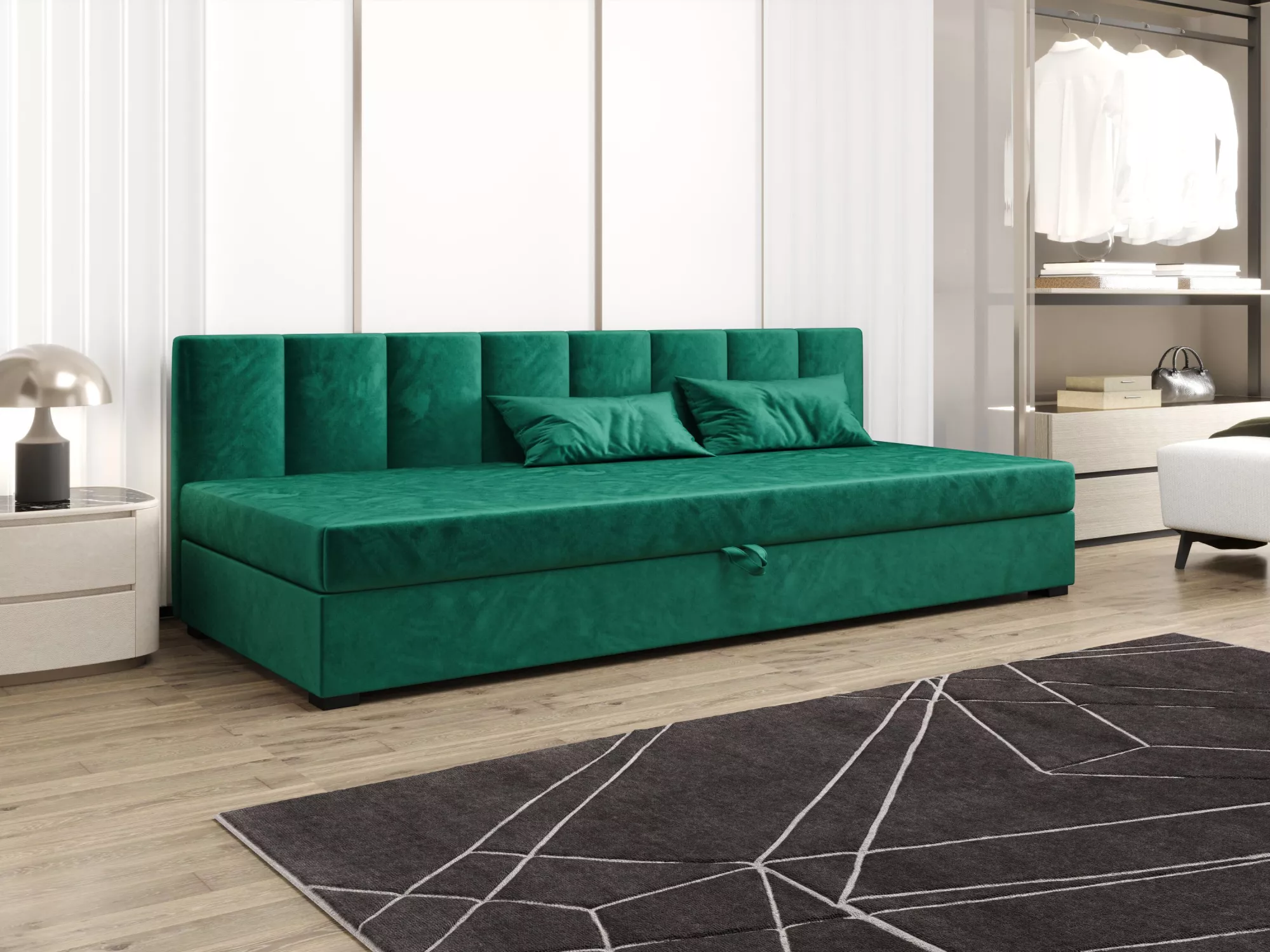 Súčasťou postele je zabudovaný matrac a úložný priestor.