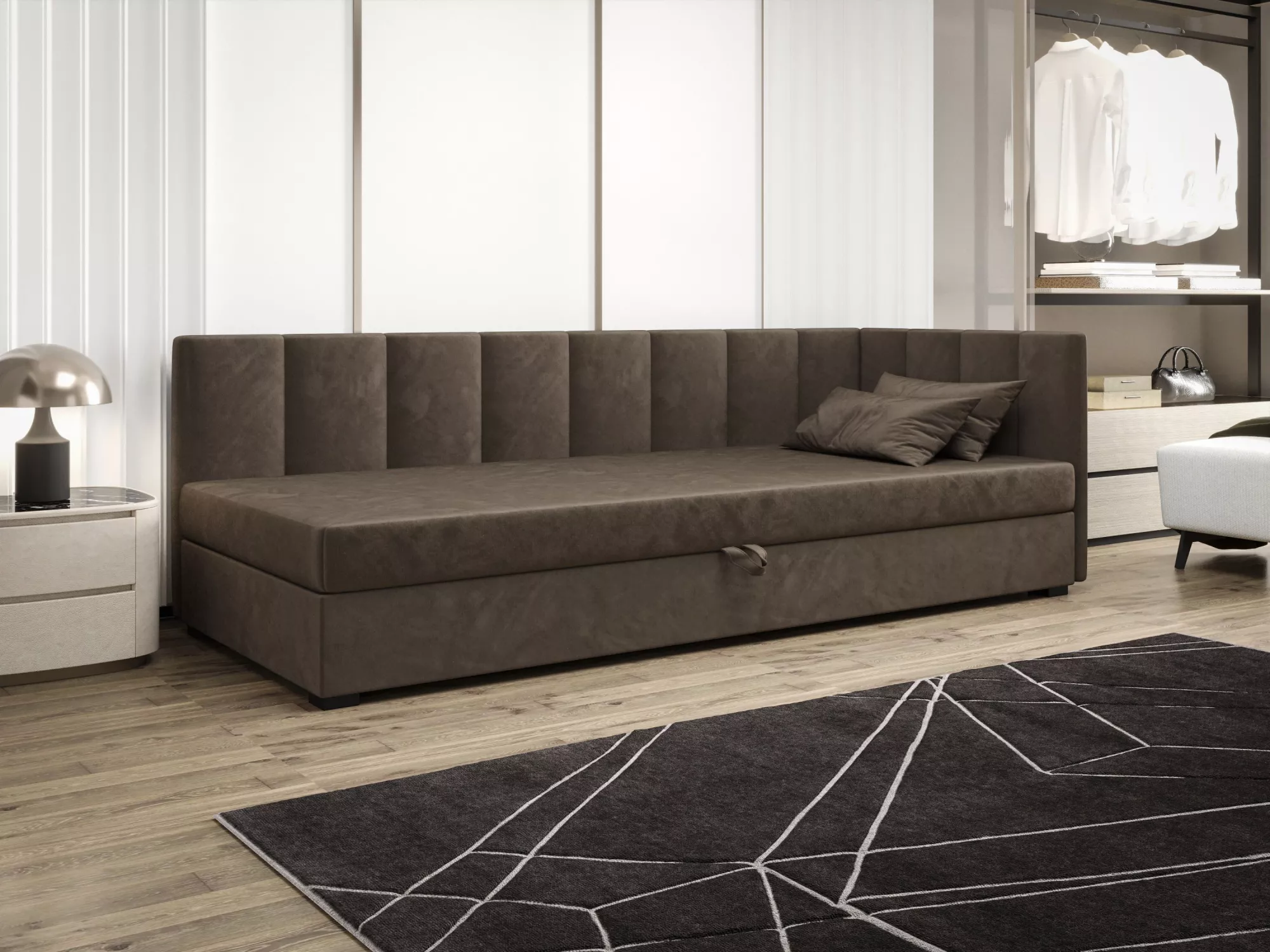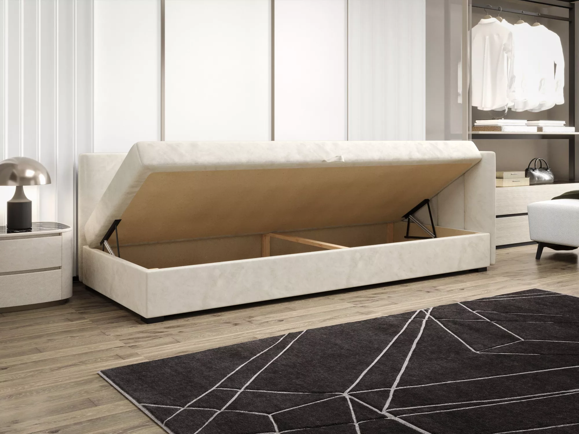 Súčasťou postele je zabudovaný matrac a úložný priestor.
