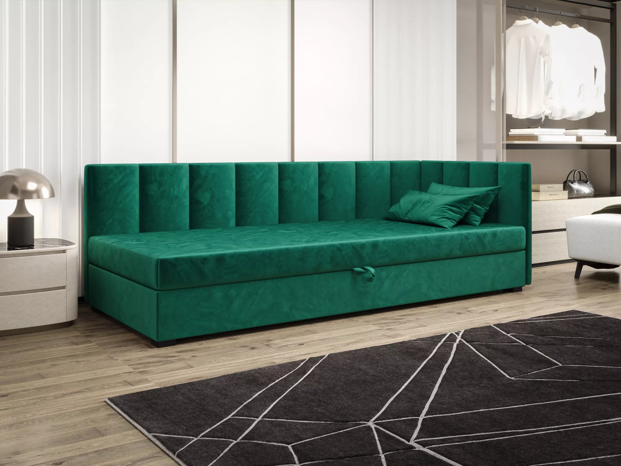 Súčasťou postele je zabudovaný matrac a úložný priestor.