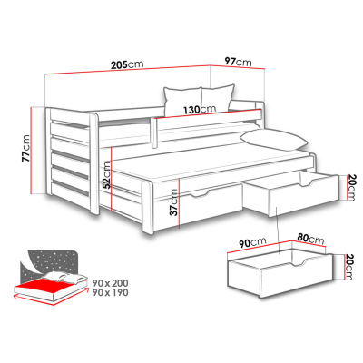 - prístelka: 97/37/195; ložná plocha: 90x190 cm