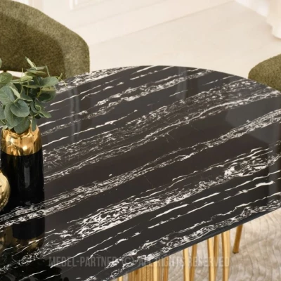 CERRITO je luxusný jedálenský stôl, ktorý zaujme oválnou doskou s čiernym mramorovým efektom a zlatou podnožou, ktorá mu dodáva glamour eleganciu. Priestranná horná doska poskytuje pohodlné miesto až pre 6 osôb, ideálne pre rodinné večere aj slávnostné príležitosti. Kombinácia odolného povrchu s vysokým leskom a výrazného dizajnu robí zo stolíka stredobod každého štýlového interiéru. CERRITO je dokonalým spojením praktickosti, prestíže a nadčasového štýlu.