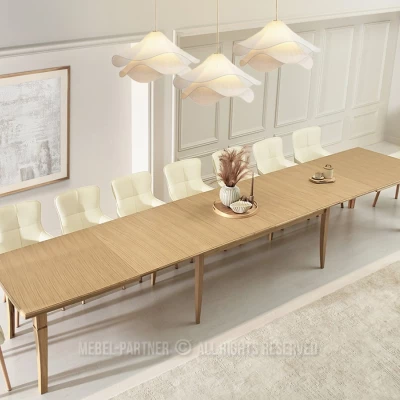 Rozkladací jedálenský stôl SALIM je dokonalou kombináciou moderného dizajnu a praktickosti. Svojím dekorom duba vnesie stôl do každej jedálne alebo kuchyne nádych prírody. Stôl je možné rozložiť na šírku až 500 cm.