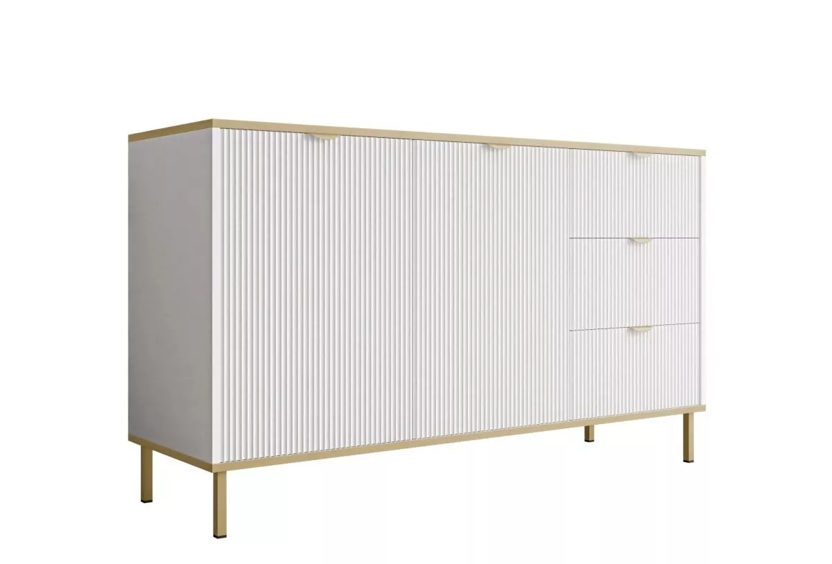 Vneste do interiéru eleganciu aj praktickosť so širokou komodou PULLMAN. Priestranná skrinka a 3 zásuvky poskytnú dostatok miesta na oblečenie, dokumenty aj domáce doplnky. Horná doska so šírkou 135 cm sa skvele hodí pre kvety, dekorácie alebo obľúbené fotografie. Drážkované predné diely a zlaté detaily zvýraznia moderný štýl a dodajú priestoru luxusný vzhľad.
