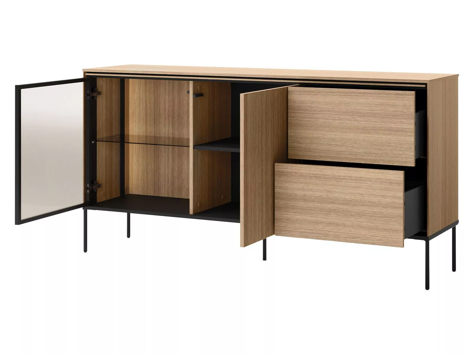 Doprajte interiéru moderný nádych s presklenou komodou ANACORTES. Bočná skrinka s LED osvetlením zvýrazní dekorácie, zatiaľ čo uzavretá stredová skrinka a bočné zásuvky poskytnú priestor na všetko potrebné. Vysoké kovové nohy dodávajú nábytku stabilitu a umožňujú ľahké upratovanie pod komodou. Minimalistický industriálny dizajn vnesie do priestoru štýl a eleganciu.
