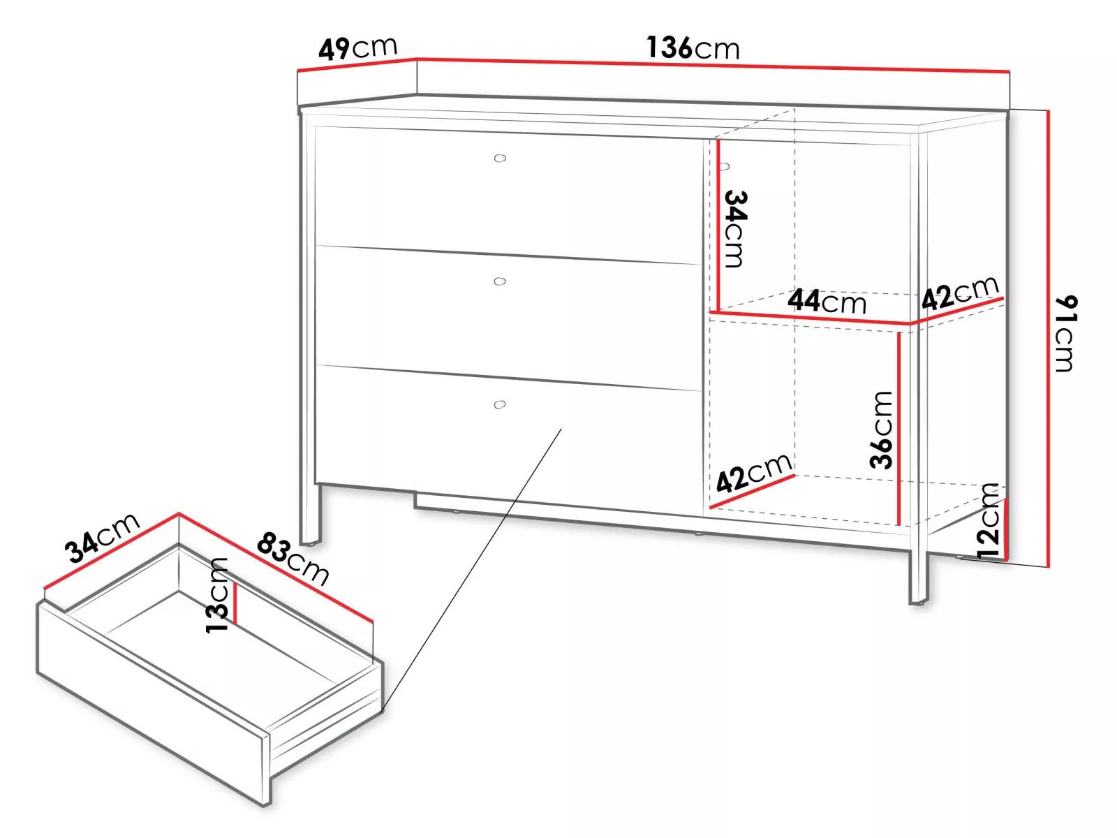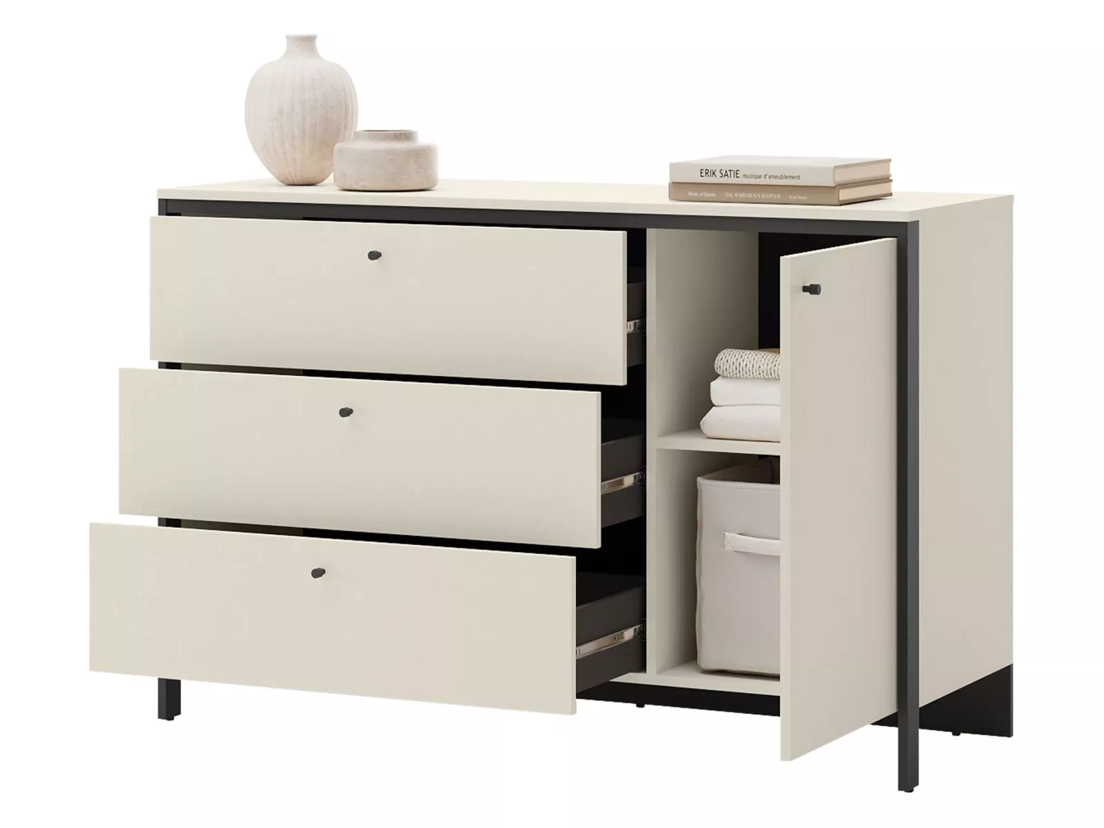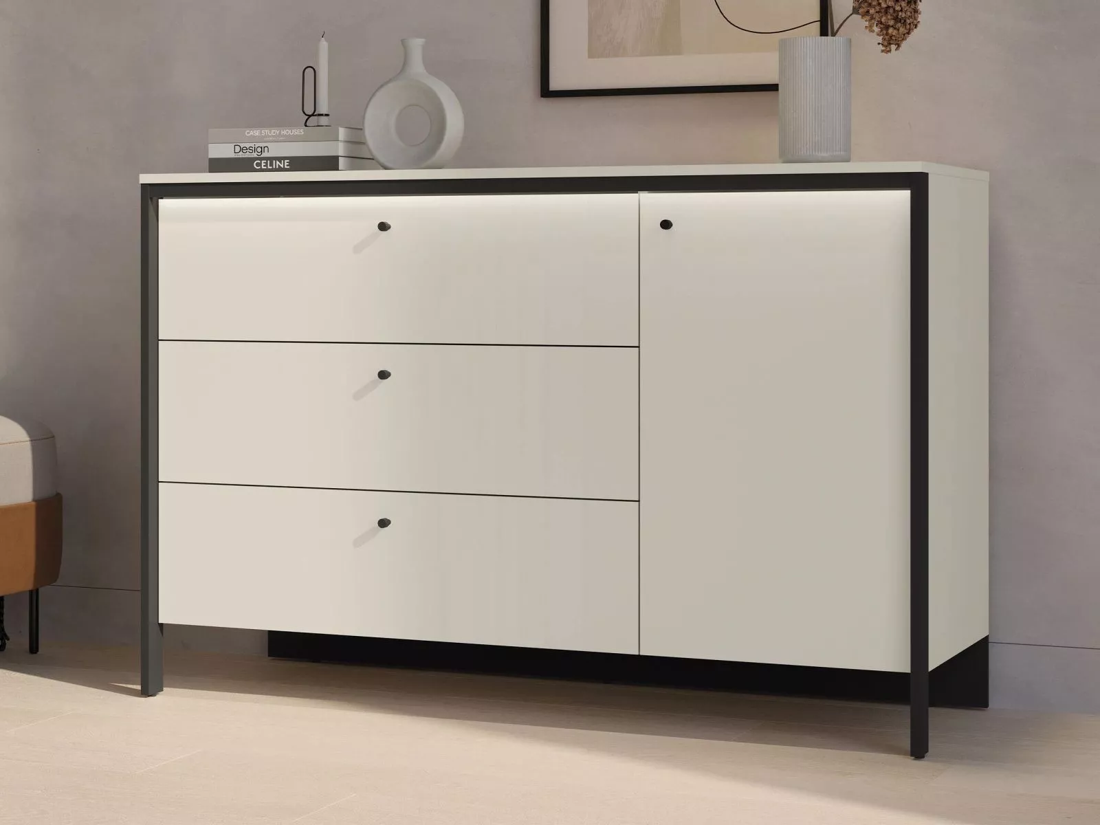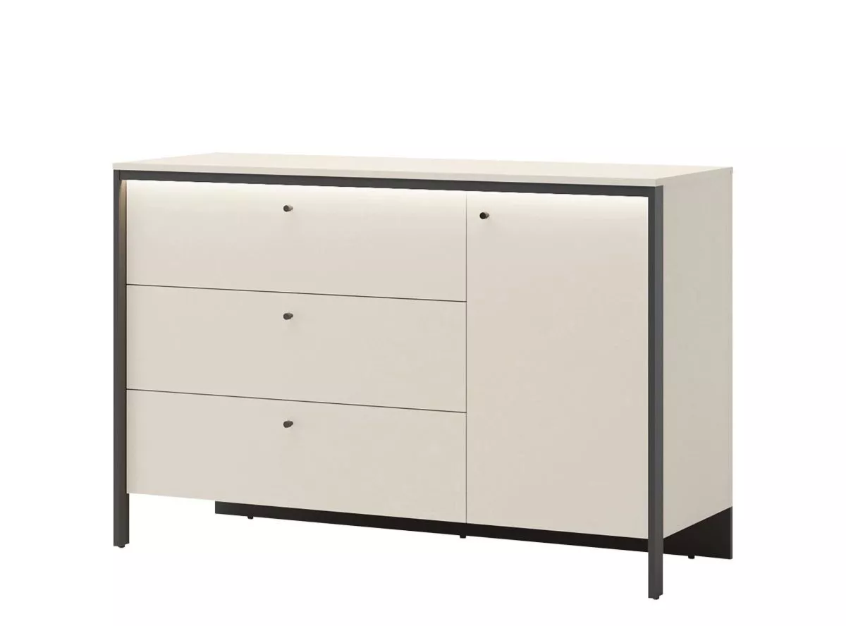 Obklopte sa štýlom so širokou kombinovanou komodou REDMOND, ktorá spája moderný vzhľad s premyslenou funkčnosťou. Priestranné zásuvky a uzavretá skrinka zaistia poriadok v oblečení, dokumentoch aj doplnkoch. LED osvetlenie dodá komode pôsobivý efekt a podčiarkne elegantný charakter. Kontrastné detaily na nohách a úchytoch zvýraznia minimalistický dizajn, ktorý vynikne v spálni, obývačke i chodbe.