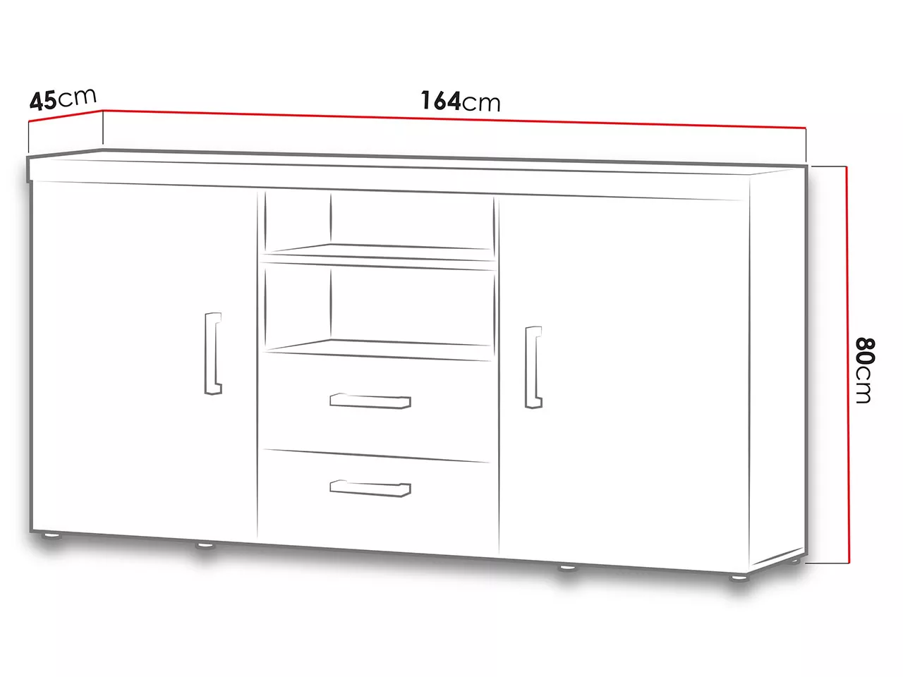Konštrukcia komody je vyrobená z vysoko kvalitnej drevotrieskovej laminovanej dosky v matnej farbe. Dvierka sú vyrobená z MDF materiálu v lesklom prevedení.