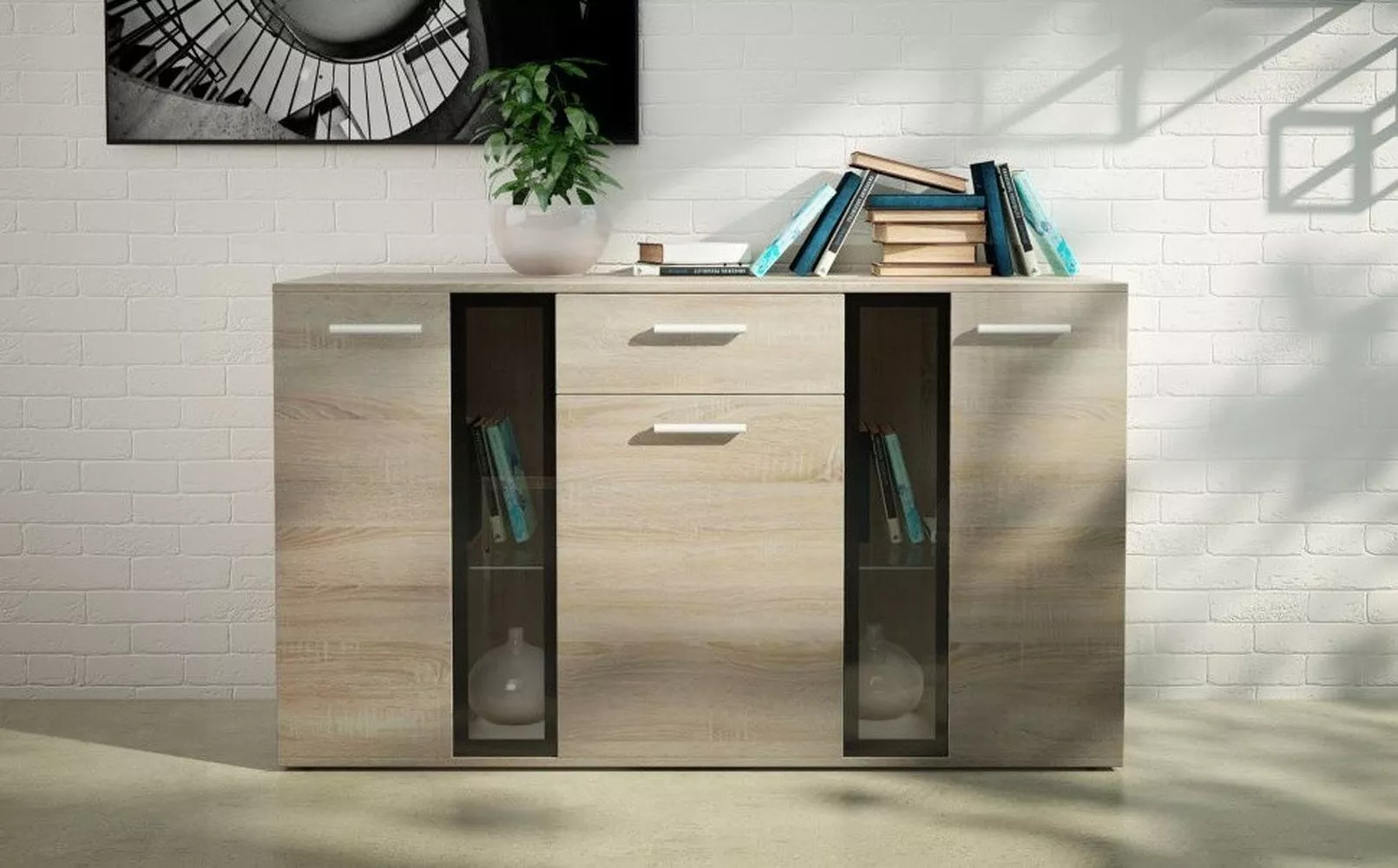 Štýlová komoda Sana bude ozdobou každej miestnosti. Okrem atraktívneho vzhľadu oceníte dostatok miesta na ukladanie vecí, presklené časti využijete na vystavenie dekorácií. Komoda je vyrobená z laminovanej dosky, ktorá vyniká odolnosťou proti poškriabaniu.
