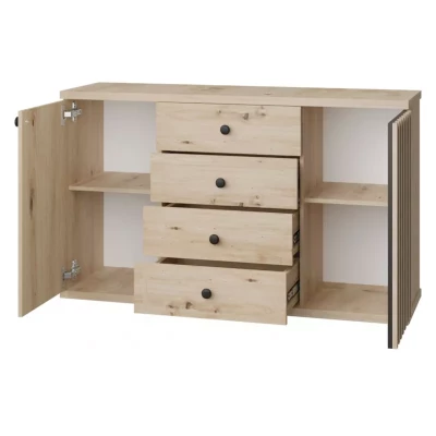 Kombinovaná komoda AIMY nájde svoje využitie v každom modernom aj dizajnovom interiéri. V priestranných skrinkách a zásuvkách je možné ľahko ukladať akékoľvek predmety, vrátane študijného materiálu či sezónneho oblečenia. Otváracia úchytka je dômyselne ukrytá v jednej zo skriniek, pretože je súčasťou ozdobných lamiel na jej prednej strane. Guľové pánty použité v zásuvkách zaisťujú vysoký komfort používania. Skrinky sú vybavené inovatívnym systémom tichého zatvárania.