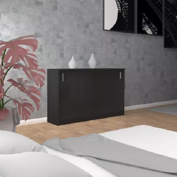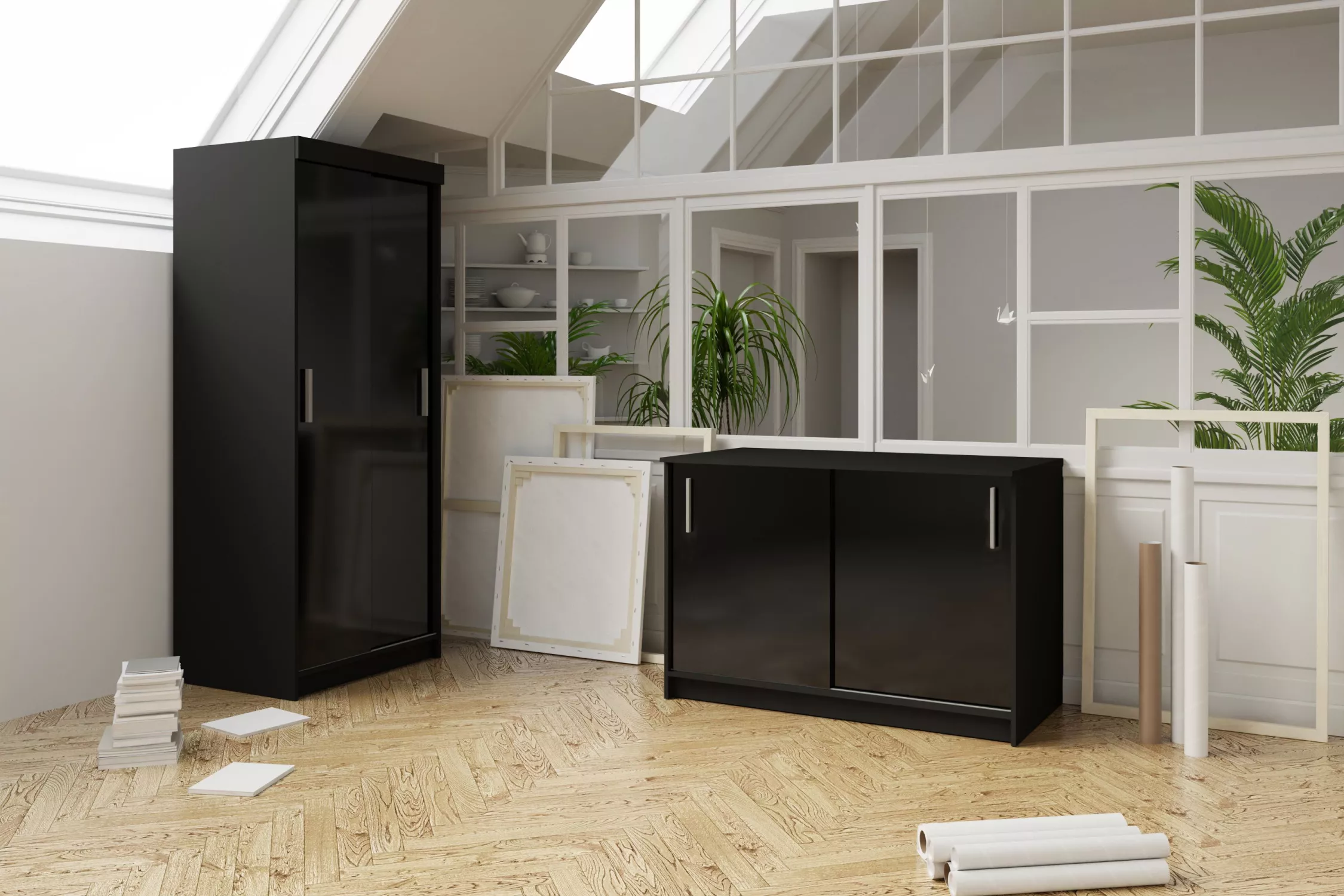 Komoda s posuvnými dverami ALMITA je vnútri rozdelená policou pre prehľadnejšie usporiadanie vecí. Dvierka sú vybavené striebornými úchytmi. Komoda sa hodí do spálne, detskej alebo študentskej izby.