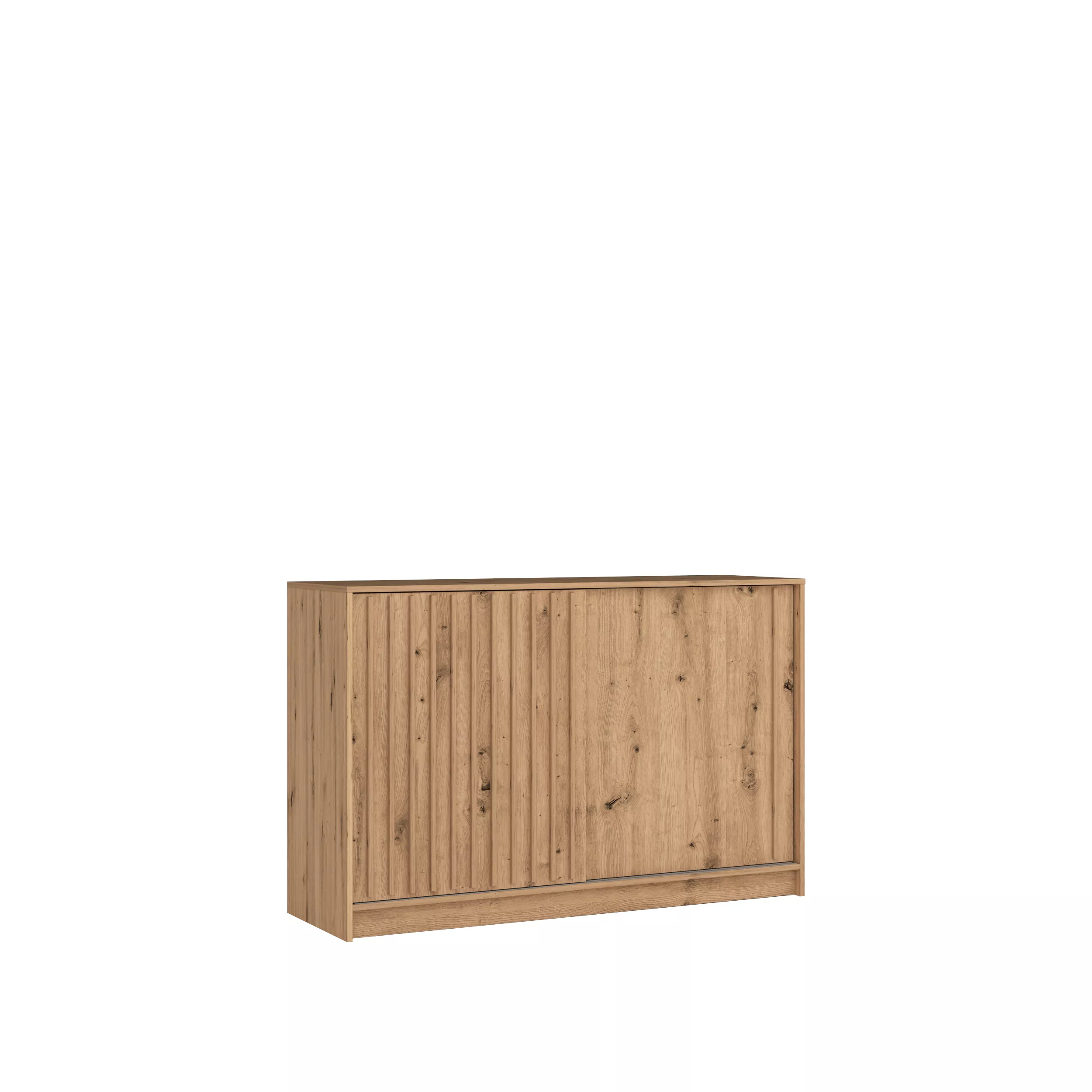 Široká komoda s dvierkami KAREN je vo vnútri rozdelená policami pre prehľadnejšie usporiadanie vecí. Elegantný vzhľad podčiarkujú lamely na dvierkach. Vďaka svojim rozmerom sa bude skvele hodiť do všetkých menších priestorov.