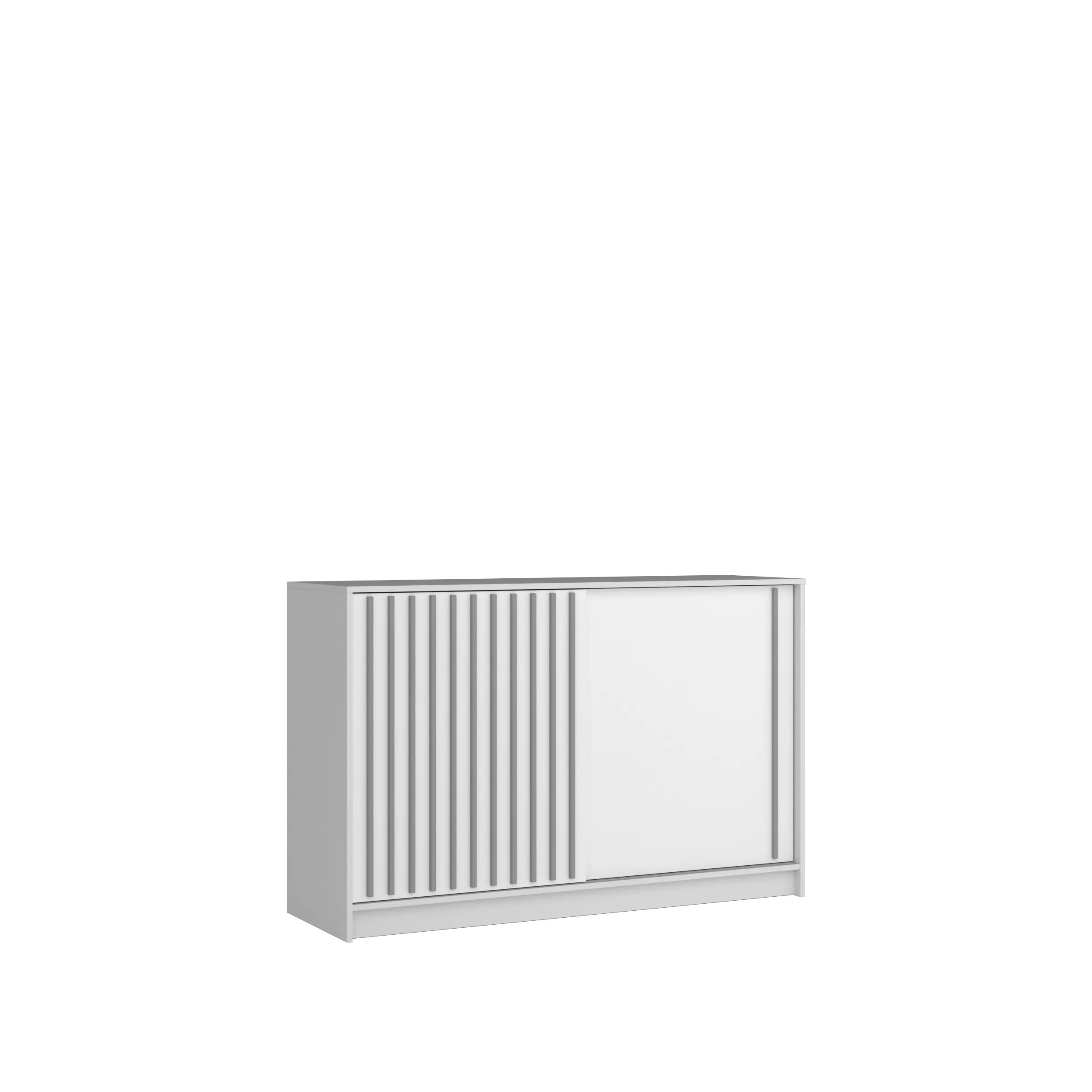 Široká komoda s dvierkami KAREN je vo vnútri rozdelená policami pre prehľadnejšie usporiadanie vecí. Elegantný vzhľad podčiarkujú lamely na dvierkach. Vďaka svojim rozmerom sa bude skvele hodiť do všetkých menších priestorov.
