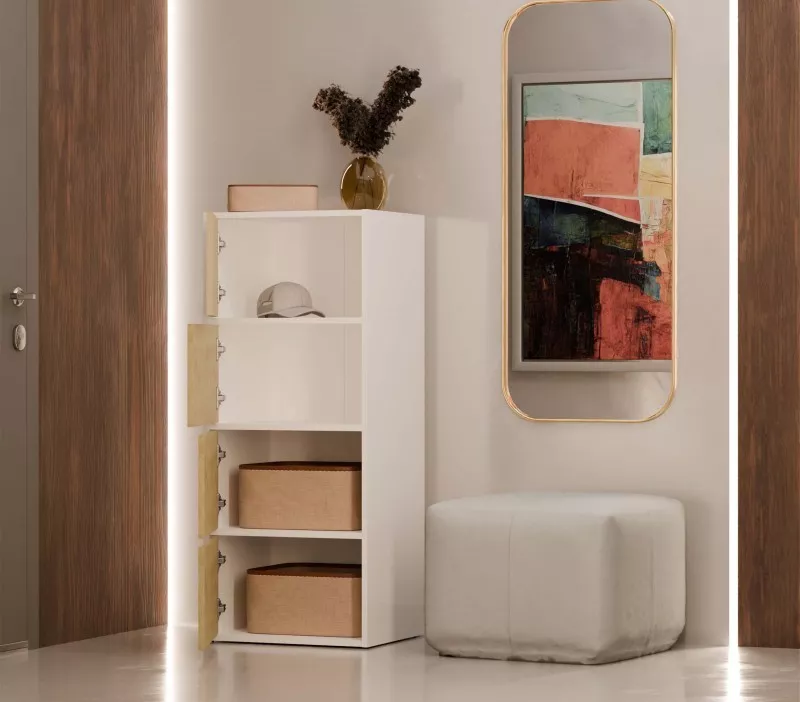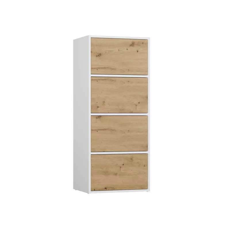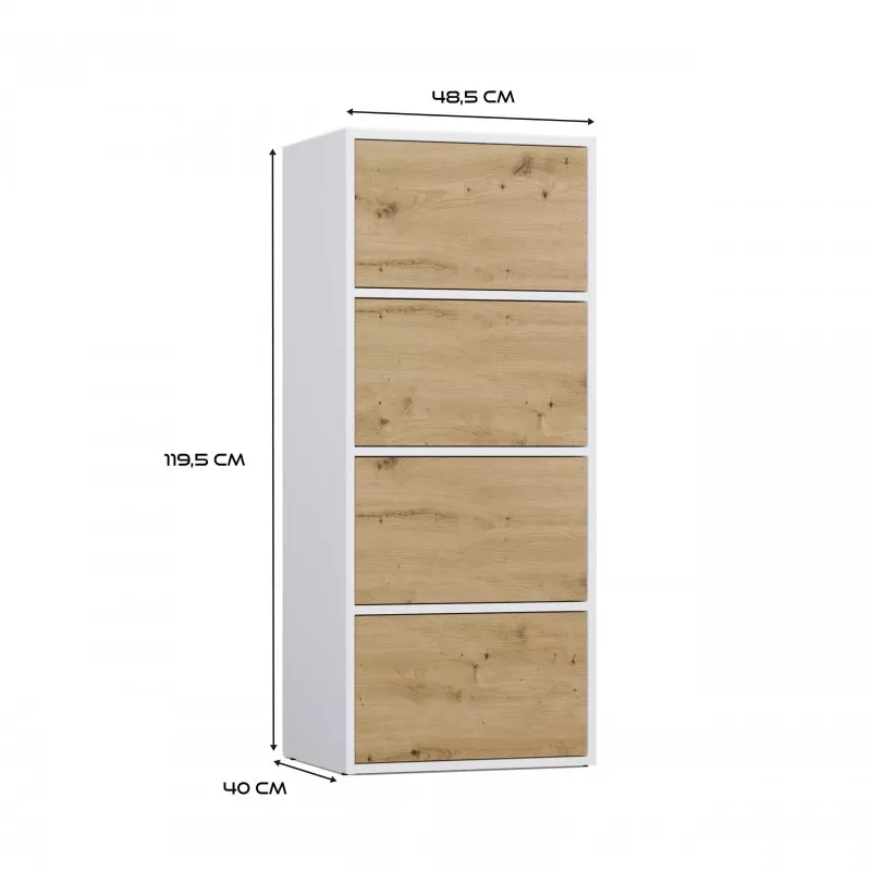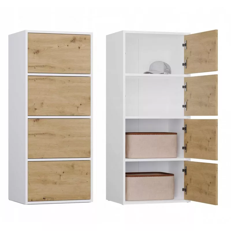 Úzka komoda s dvierkami ATALLA - biela / dub artisan