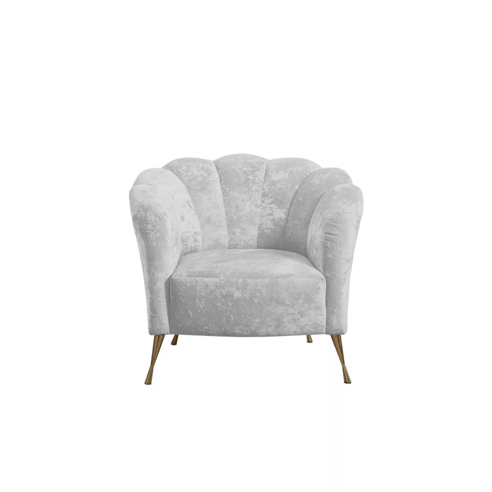 Charakteristickými znakmi štýlového kresla KOHANA sú konštrukcia v tvare mušle a vysoké kovové nohy. Príjemná mäkká plyšová látka dokonale zvýrazňuje jemné prešívanie.