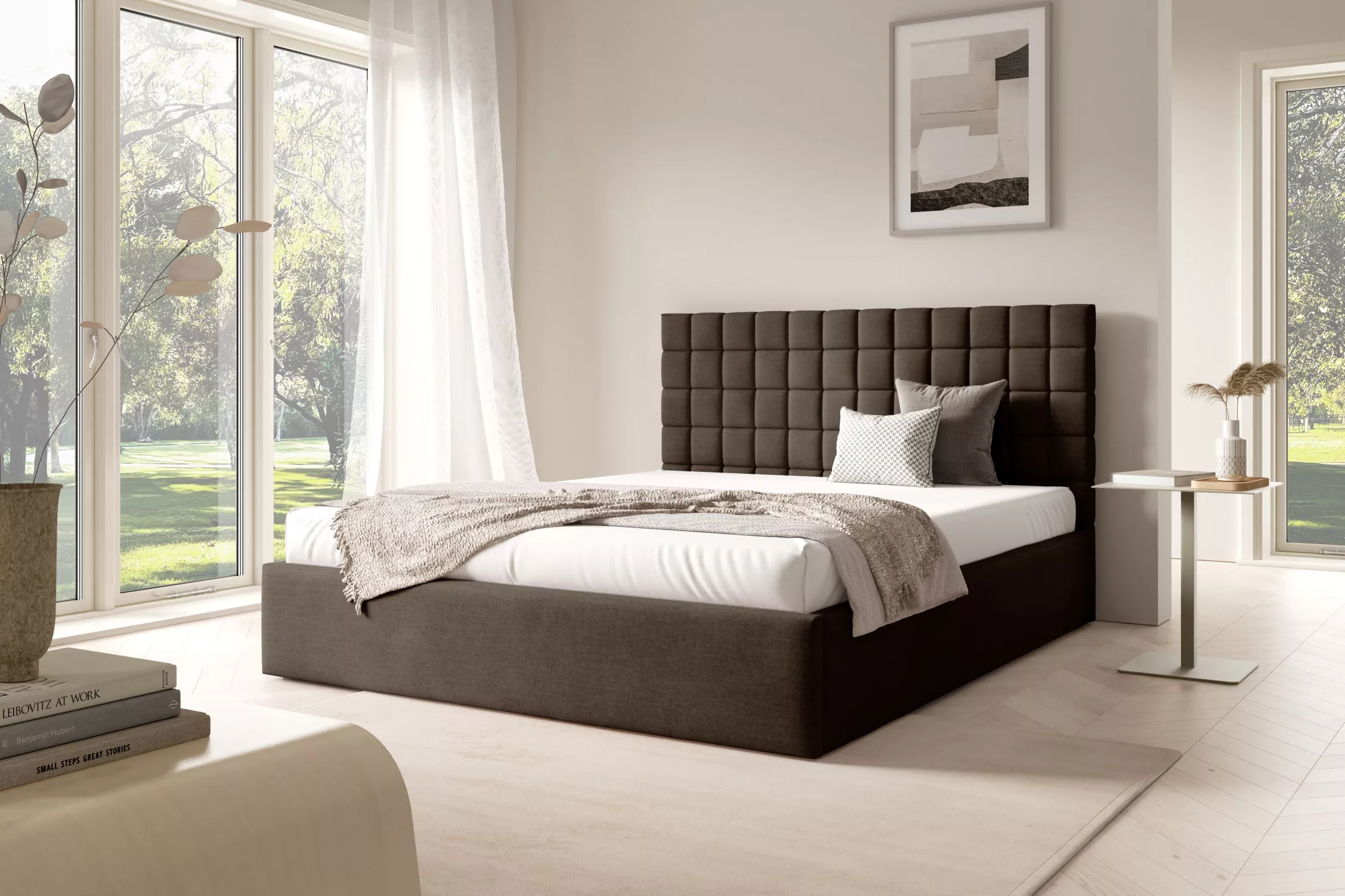 Nadčasová manželská posteľ 160x200 TAISA 3 skvele zapadne do škandinávskych a minimalistických spální. Zaujme svojim dizajnovým čelom, ktoré zároveň zamedzí poškriabaniu a zašpineniu steny. Posteľ disponuje úložným priestorom pod vyklápacím roštom.