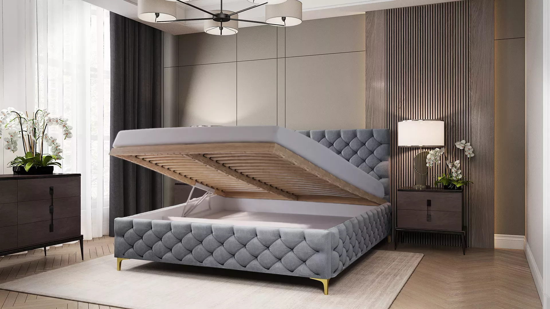 Čalúnená posteľ 140x200 RUBBINA 2 kombinuje moderný dizajn, praktickosť a pohodlie. Je vybavená úložným priestorom na uskladnenie lôžkovín alebo sezónneho oblečenia a vysokým čelom, ktoré zabraňuje zašpineniu a poškriabaniu steny.