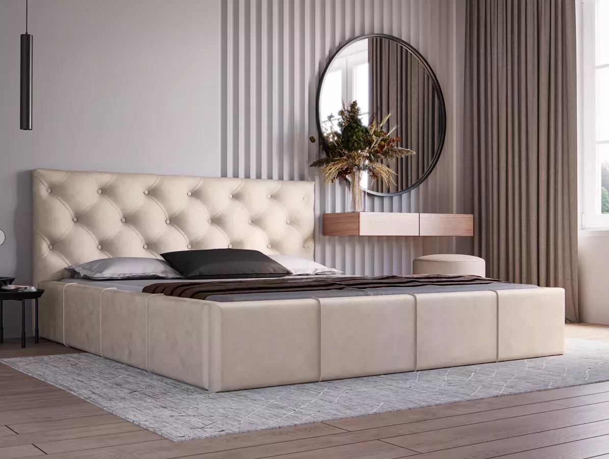 Elegantná čalúnená posteľ 160x200 NURIA 2 s prešívaným čelom sa hodí do všetkých moderných spální. Posteľ je vybavená praktickým úložným priestorom na uskladnenie sezónneho oblečenia alebo posteľnej bielizne.