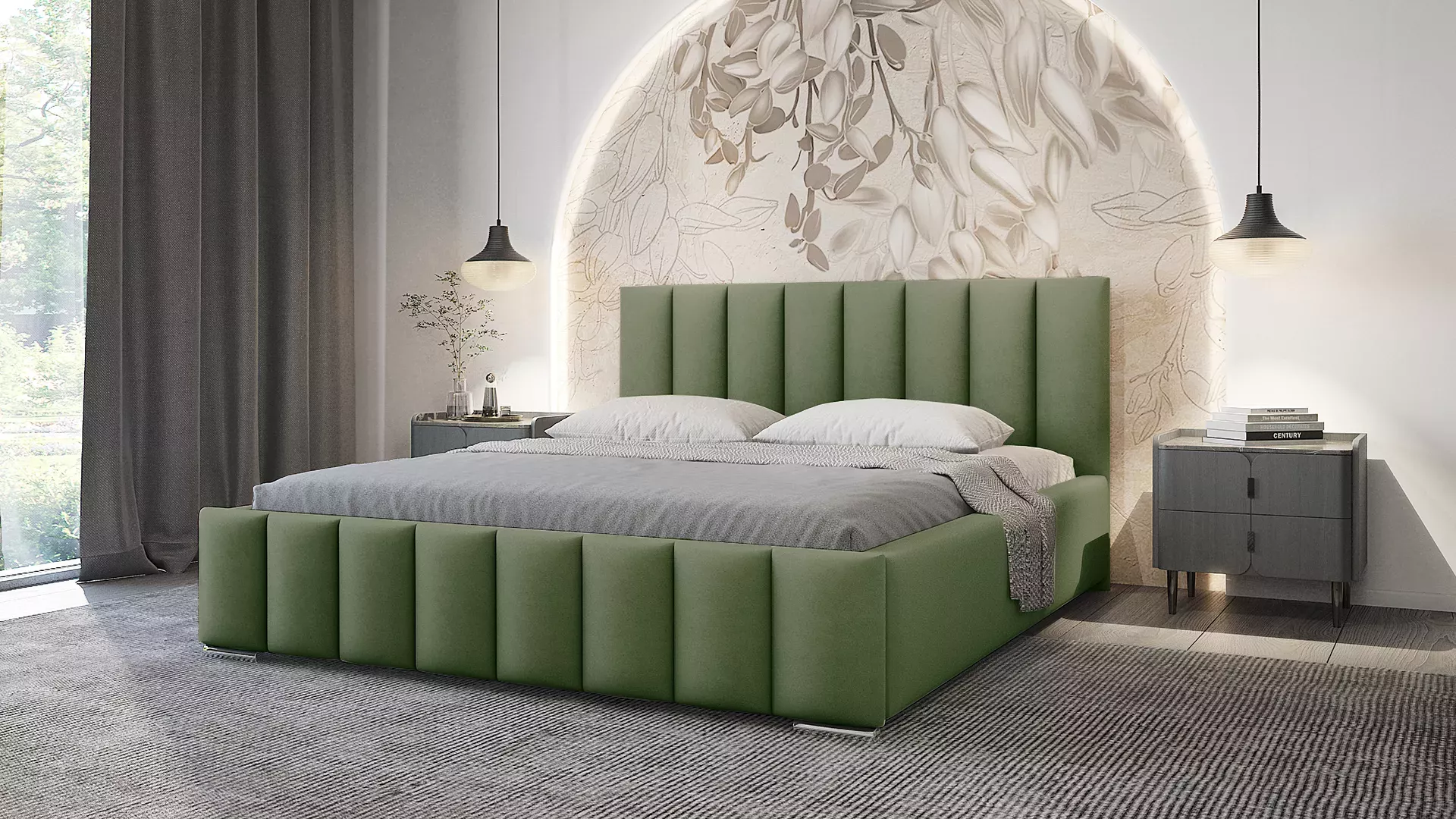 Elegantná čalúnená posteľ 200x200 MADALENA 2 s úložným priestorom - khaki