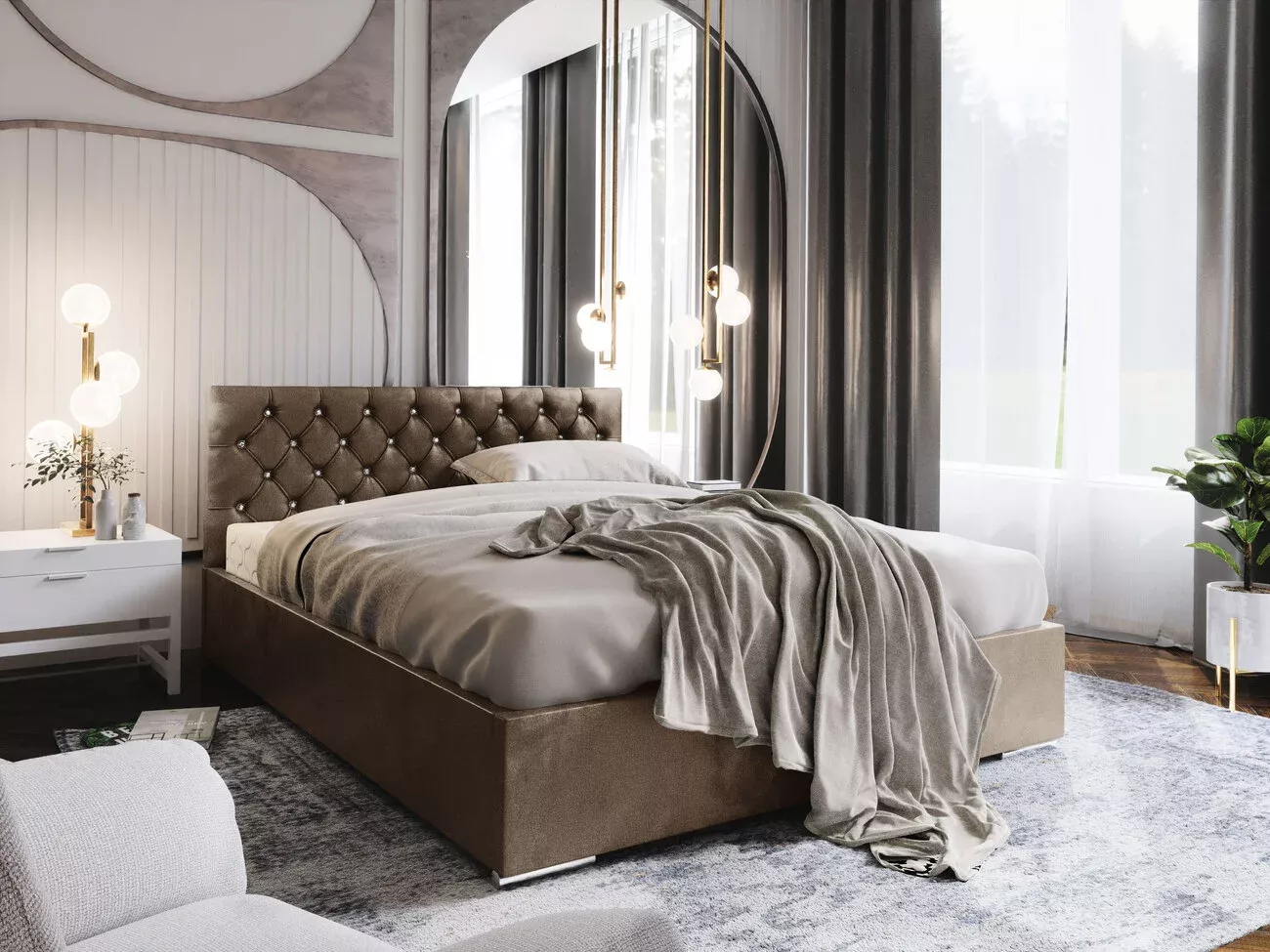 Dizajnová posteľ 180x200 EITHNE 1 s roštom zaujme svojím prešívaným čelom s gombíkmi. Posteľ disponuje praktickým úložným priestorom na uloženie posteľnej bielizne alebo sezónneho oblečenia.