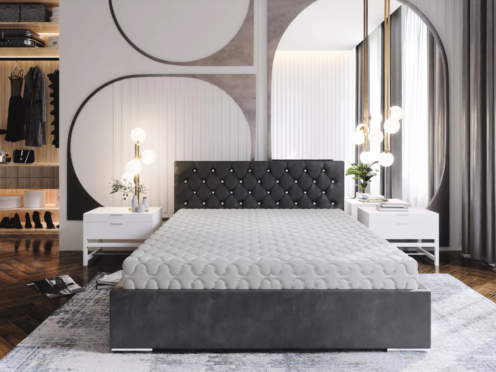 Dizajnová posteľ 180x200 EITHNE 1 s roštom zaujme svojím prešívaným čelom s gombíkmi. Posteľ disponuje praktickým úložným priestorom na uloženie posteľnej bielizne alebo sezónneho oblečenia.