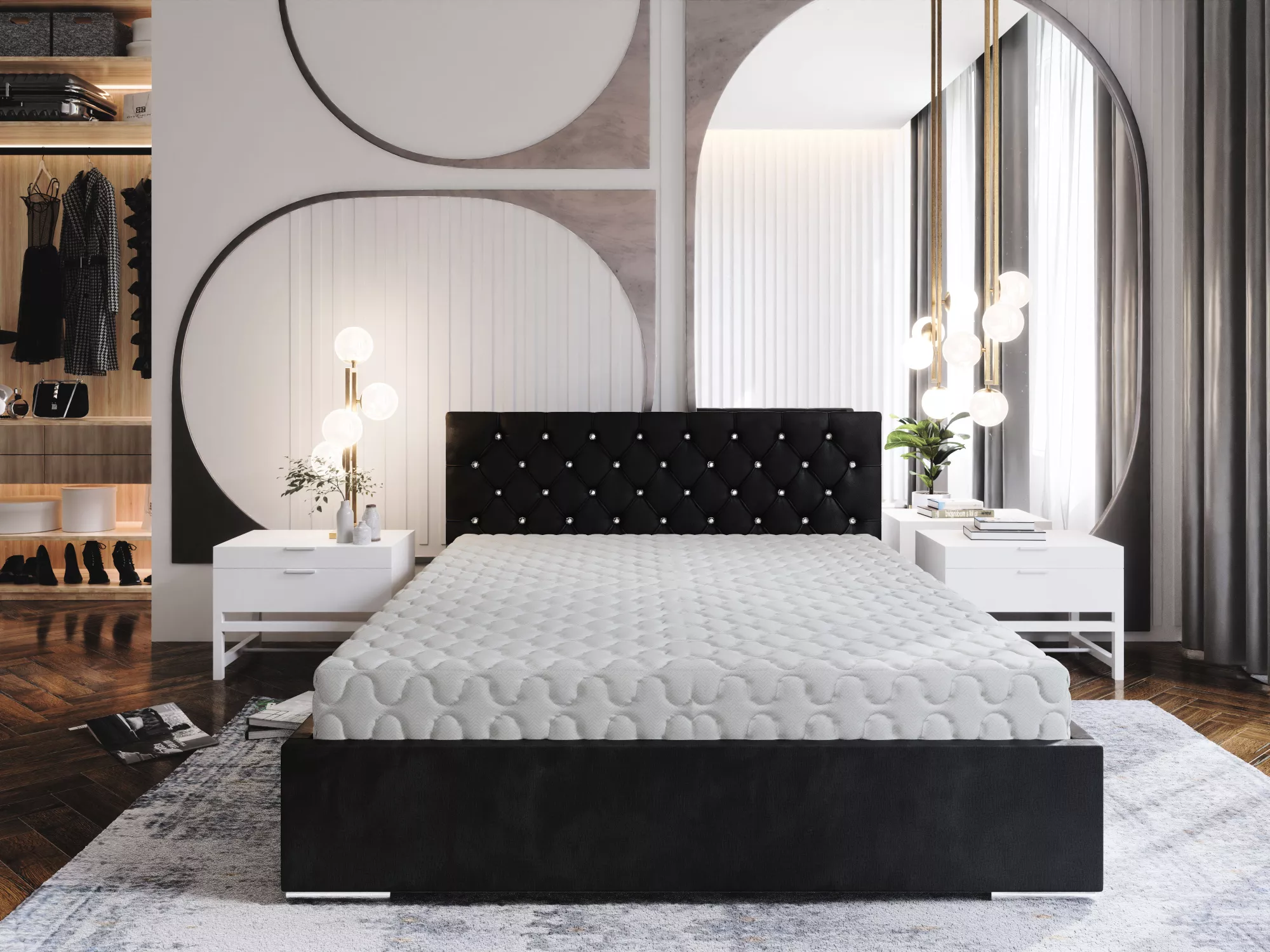 Dizajnová posteľ 180x200 EITHNE 1 s roštom zaujme svojím prešívaným čelom s gombíkmi. Posteľ disponuje praktickým úložným priestorom na uloženie posteľnej bielizne alebo sezónneho oblečenia.