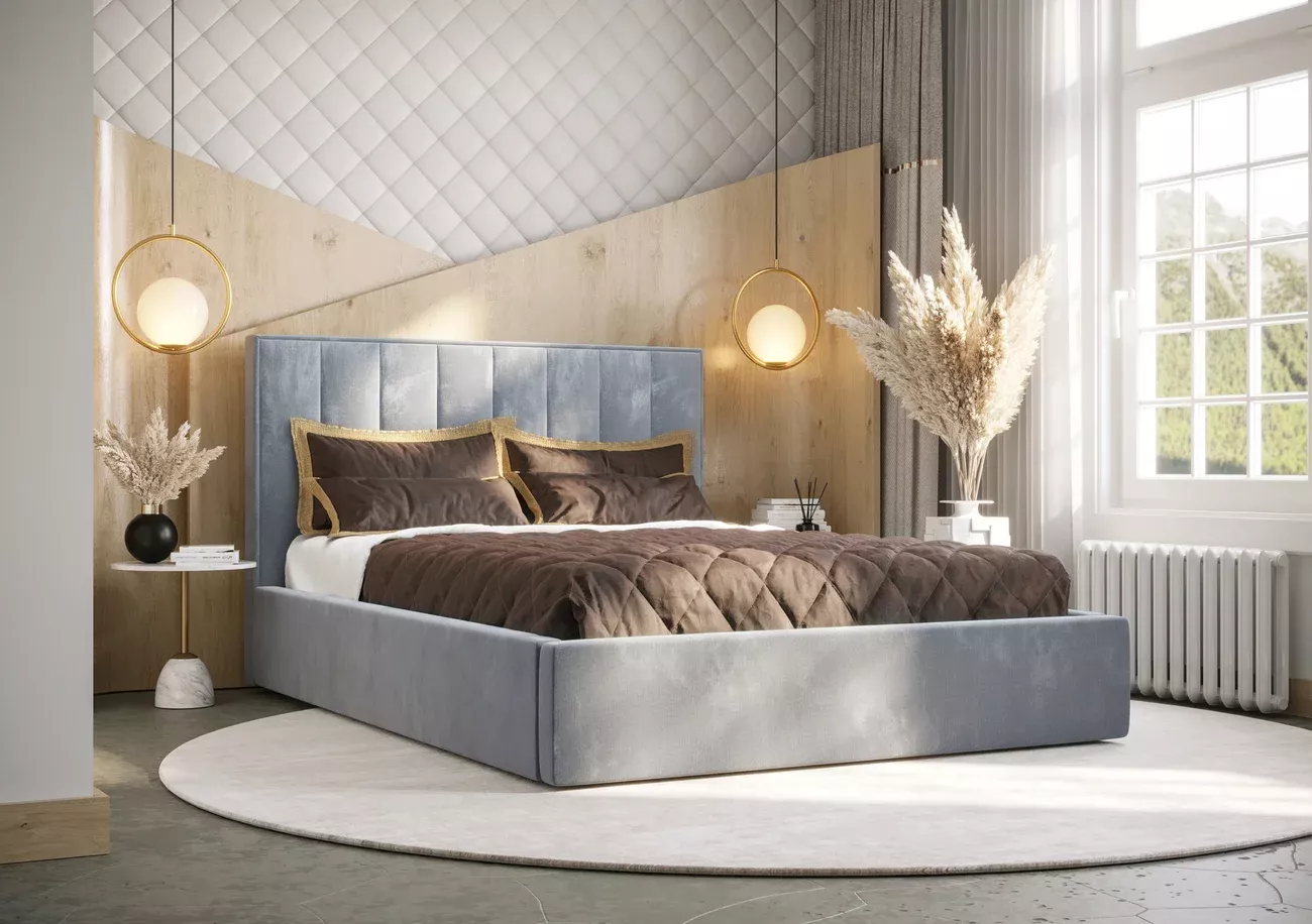 Čalúnené dvojlôžko 160x200 WALTRAUD 1 s roštom a úložným priestorom sa vyznačuje štýlovým vysokým čalúneným čelom, ktoré plní dekoratívnu funkciu, a zároveň chráni stenu pred znečistením. Posteľ tiež disponuje praktickým úložným priestorom na uloženie posteľnej bielizne a sezónneho oblečenia.