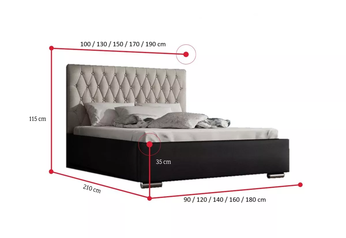 Manželská posteľ 160x200 SIRENA 1 s prešívaným čelom zdobeným gombíkmi sa stane dominantou každého priestoru. Boky postele sú potiahnuté čiernou eko kožou. Kovové strieborné nožičky dodávajú posteli atraktívny dizajn.