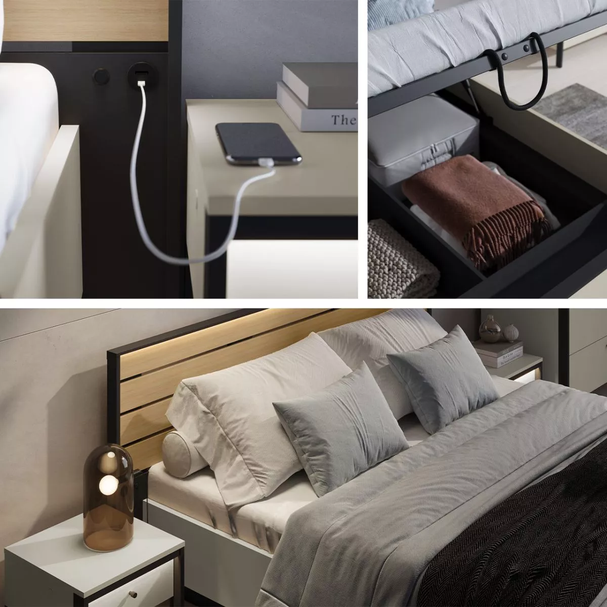 - USB-C a USB-A port na oboch stranách postele (DC 5 V / max. 2 × 1,05 A)