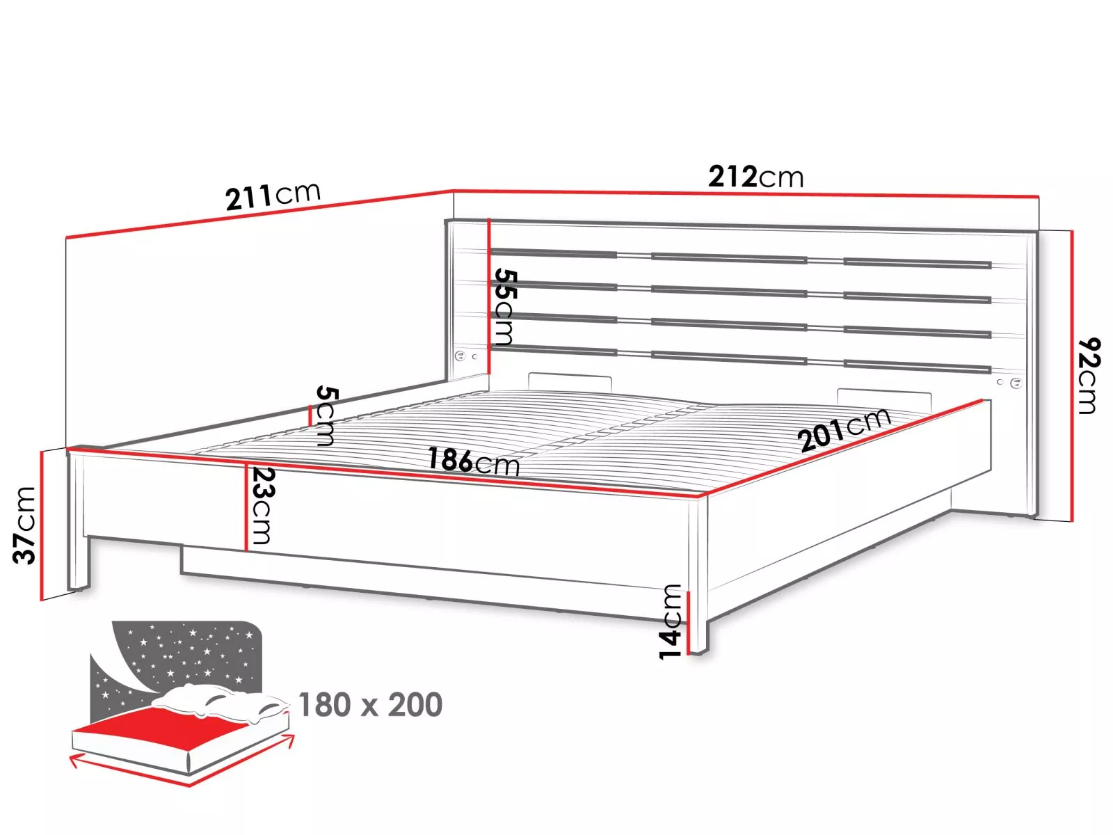 - ložná plocha: 180x200 cm