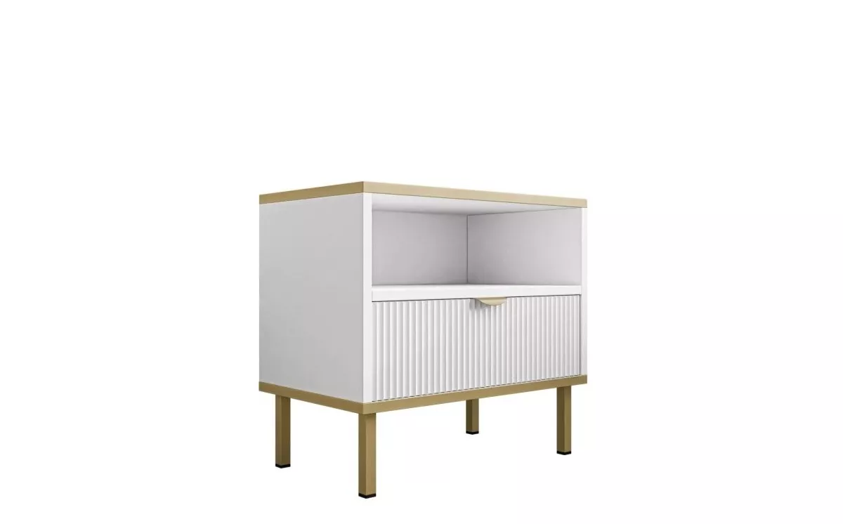 Doprajte spálni elegantný doplnok v podobe nočného stolíka PULLMAN. Otvorená polica a uzavretá zásuvka ponúknu dostatok priestoru na všetko, čo chcete mať po ruke. Vyvýšená konštrukcia so zlatými kovovými nohami uľahčí používanie aj upratovanie pod stolíkom. Jemné detaily a moderný tvar dodajú spálni nádych vycibreného štýlu.
