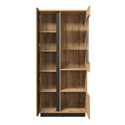 Nábytok do obývacej izby MILAGRA 3 sa vyznačuje jedinečným dizajnom, ktorý zaujme milovníkov industriálneho štýlu. Je tvorená vysokou čiastočne presklenou vitrínou, regálom, kombinovanou komodou a závesnou poličkou. Presklená vitrína je navyše vybavená bielym LED osvetlením.