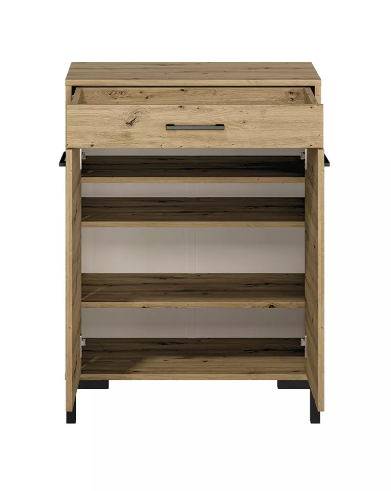 Kombinovaný botník BEDA sa hodí do všetkých moderných predsiení. Disponuje plne výsuvným šuplíkom, 3 policami a 2 dvierkami.