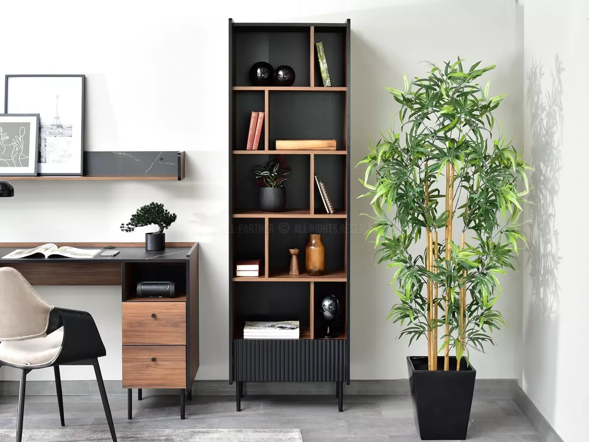 Úzky policový regál NORLAN vyniká množstvom políc a vytvára dokonalé miesto na ukladanie kníh a ďalších predmetov. Čierne kovové nohy dodávajú regálu moderný, elegantný a ľahký vzhľad.